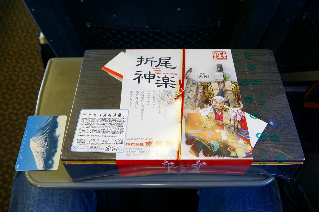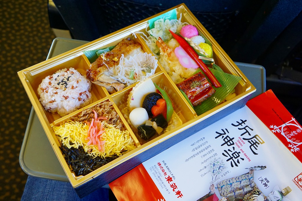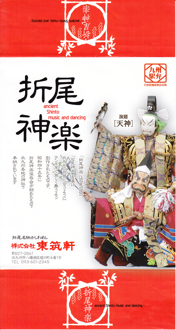 JR九州の駅弁キャンペーン「第10回九州の駅弁ランキング」の実施に合わせて、2013(平成25)年10月に発売。掛紙に描かれ、駅弁の名前にもなった折尾神楽は、1970(昭和45)年の大阪万博で人気になった島根県の石見神楽をモデルに、同年から北九州市内で行われ始めた神社での舞楽。大きなおしながきにも書かれる中身は、かしわめし、赤米ごはん、エビやオオバなどの天ぷら、タケノコやサトイモなどの煮物、うなぎ蒲焼き、花かまぼこ、地鶏照り焼き、春雨サラダ、はじかみ、豊年団子と盛りだくさん。駅弁の賞は獲れなかったが、この駅弁は2019年2月まで予約により販売された。価格は2013年の発売時で1,260円、後に1,130円または1,300円。