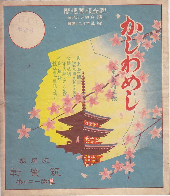1938(昭和13)年4月24日6時の調製と思われる、昔の折尾駅弁の掛紙。4月18日から24日までの観光報国週間の駅弁掛紙として、各駅各社共通で使われた絵柄だろうか。調製元の筑紫軒は1942年の4社合併でできた東筑軒の前身のひとつで、この「かしわめし」が今も折尾駅で名物として売られる。