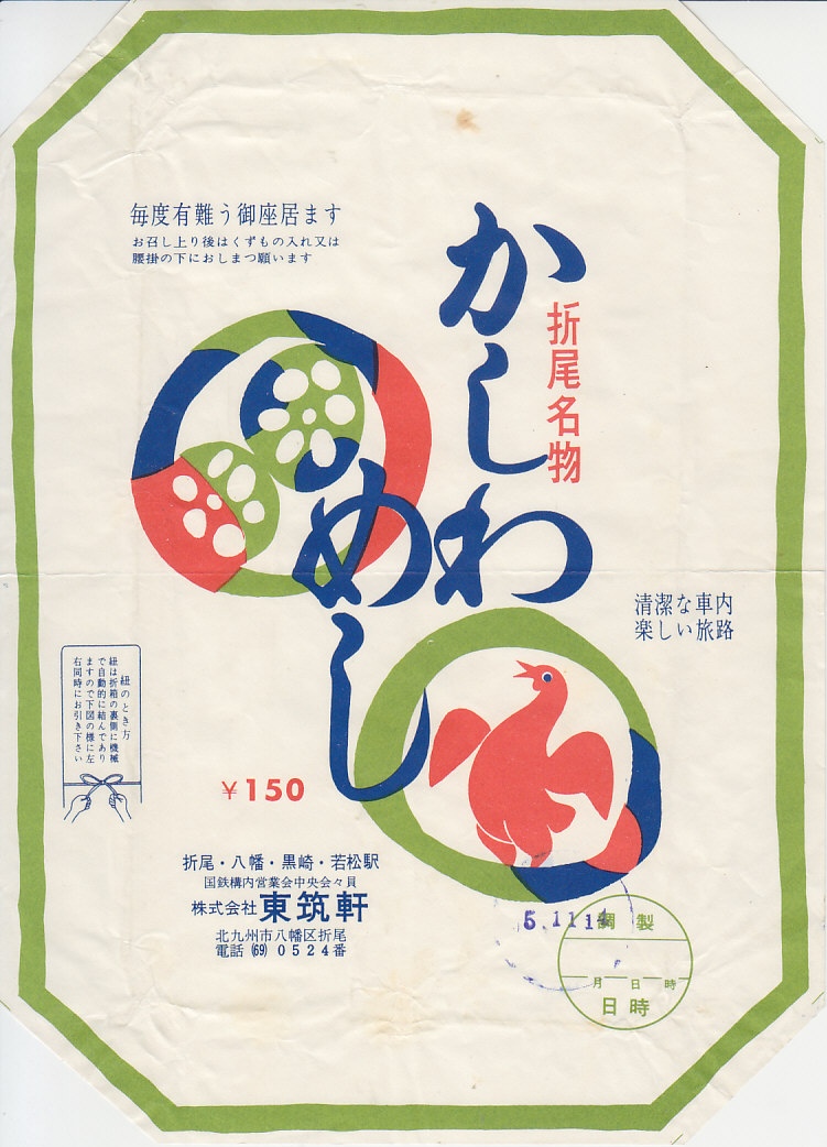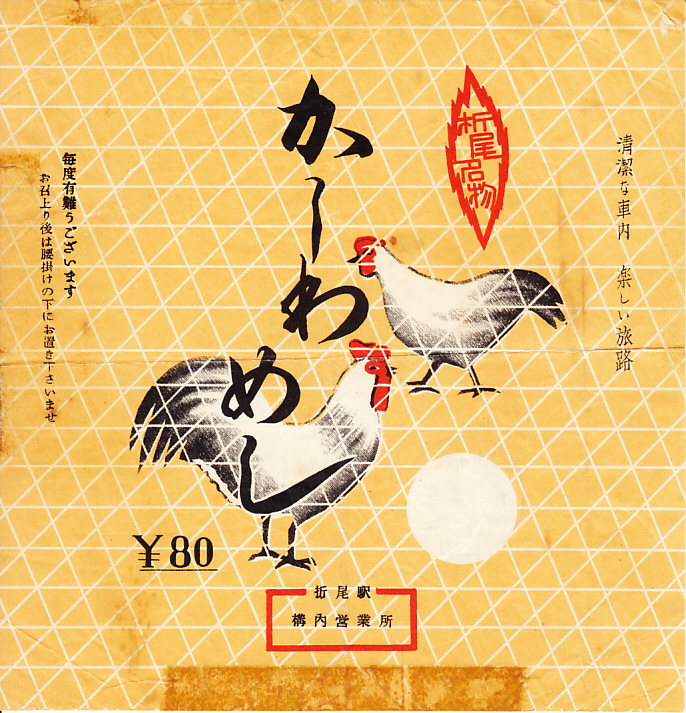 1950年代のものと思われる、昔の折尾駅弁の掛紙。調製元の記載がないが、「折尾駅構内営業所」を第二次大戦後に名乗れるのは東筑軒だけだろう。ニワトリが二羽描かれる。