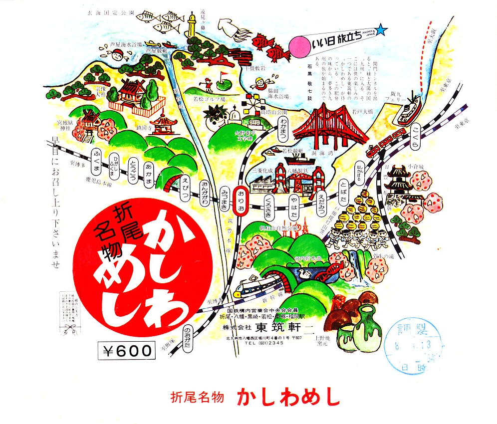 1980年代の調製と思われる、昔の折尾駅弁の掛紙。このイラストマップのつくりは、現在のものと変わらない。