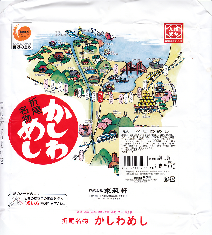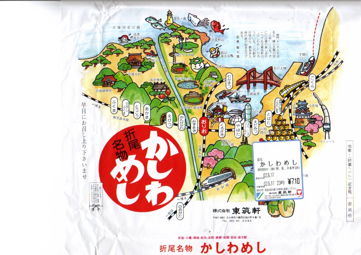 2020(令和2)年1月15日に購入した、折尾駅弁の掛紙。その絵柄は基本的に20年以上変わらないが、イラストのアップデートはなされている。ここでは2018年1月閉園のスペースワールドが消え、小倉駅付近に2017年2月開場の北九州スタジアムが出現した。容器や中身や風味は変わらない。