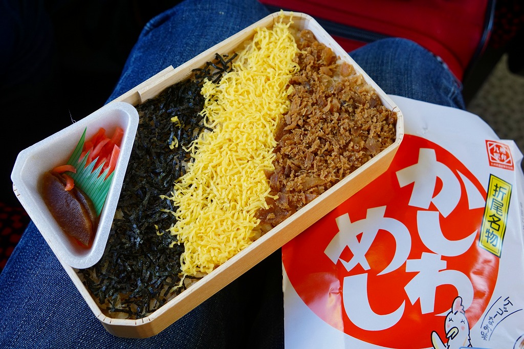 折尾駅の駅弁「驛物語」の、2014(平成26)年時点での姿。経木折に掛紙という、昔ながらの駅弁の姿を廃し、ボール紙容器を使うようになっていた。かしわめしと白飯、エビフライに鶏唐揚、ミートローフと煮物などという中身は、あまり変わっていない。価格は2014年2月の購入時で1,000円、同年4月の消費税率改定により1,030円、2020年時点で1,080円。2022年2月限りで終売のようで、3月から中身の似た要予約の新商品「折尾ものがたり」(1,100円)を発売。