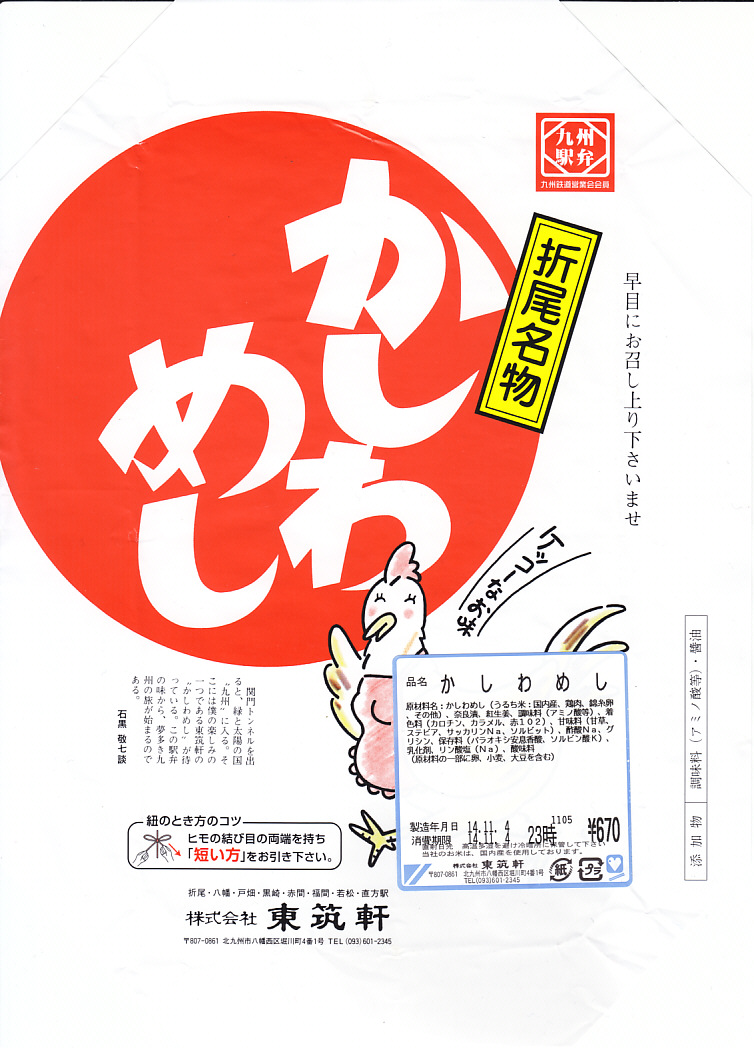 2014(平成26)年11月4日に購入した、折尾駅弁の掛紙。下記の2002年のものとも、上記の2022年のものとも、絵柄は変わらない。この当時はニワトリの絵柄が食品表示ラベルに隠れていた。中身や風味も変わらない。
