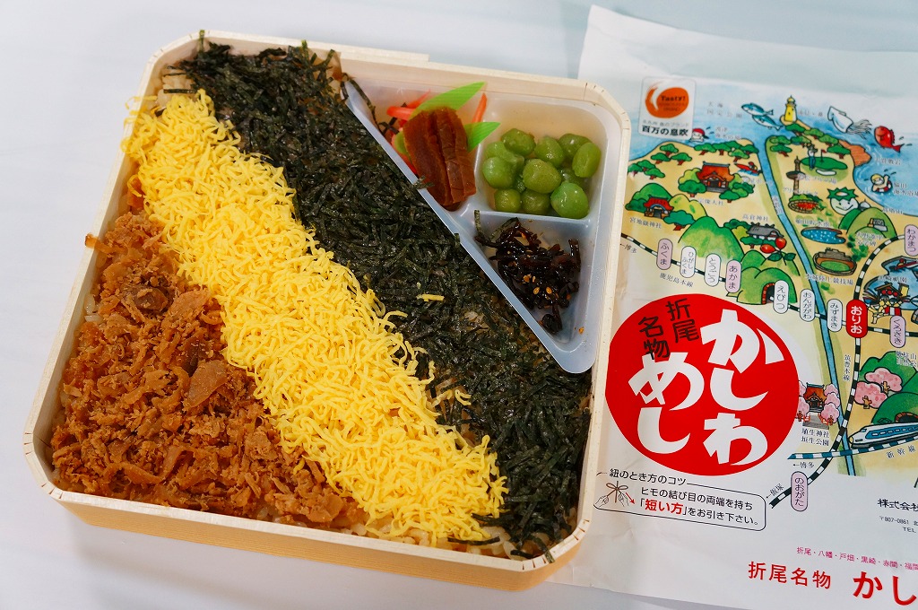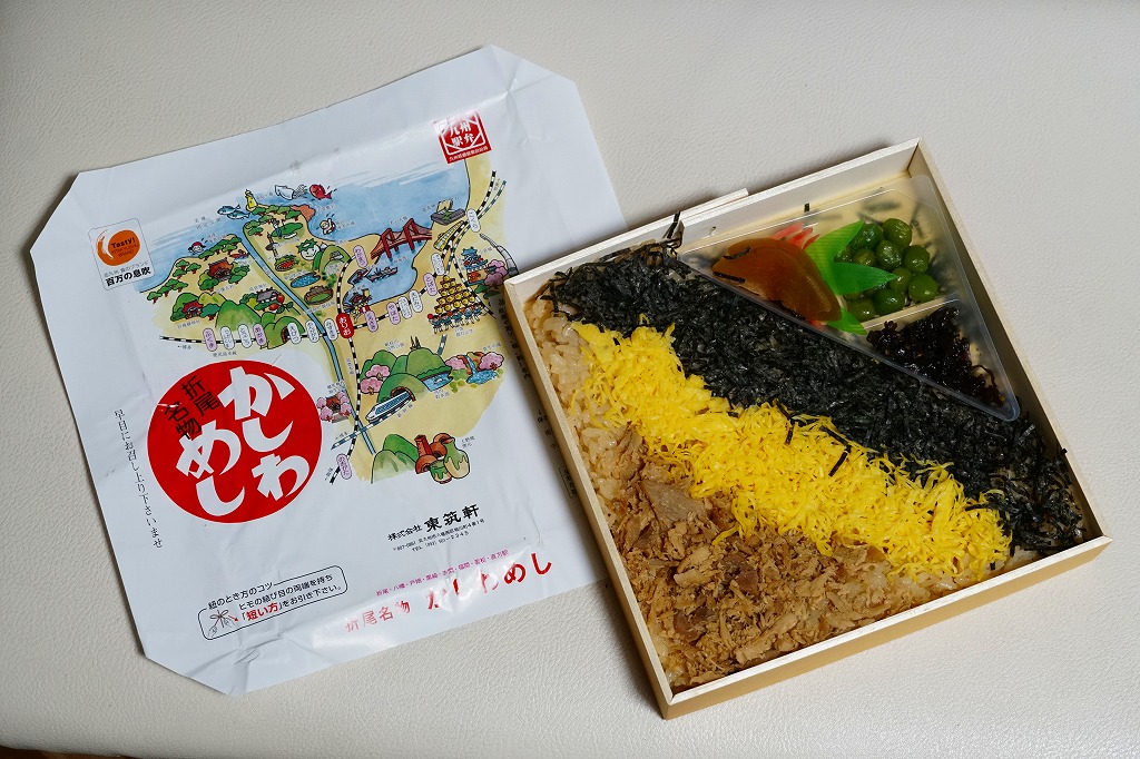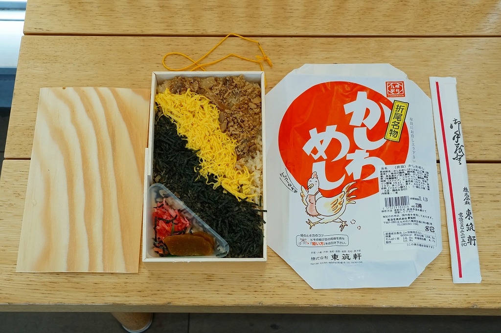 1921(大正10)年に発売。日本一の鶏飯駅弁とも評価される、折尾駅のかしわめし。昔ながらの経木の容器に、変わらぬデザインの掛紙をかけた中身は、鶏肉の炊き込み御飯の上に、刻み海苔と錦糸卵とフレーク状のかしわ(鶏)を載せた、九州北部を中心に山口県から鹿児島県まで駅弁で分布するかしわめし。秘伝の材料と製法で炊かれた御飯は口の中で甘く溶け、絶品と唸らせる味。2025年時点で年間約40万個のかしわめしが売れるという。