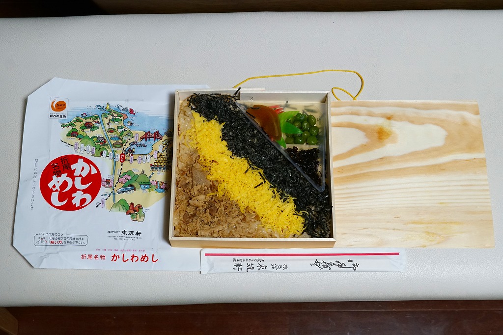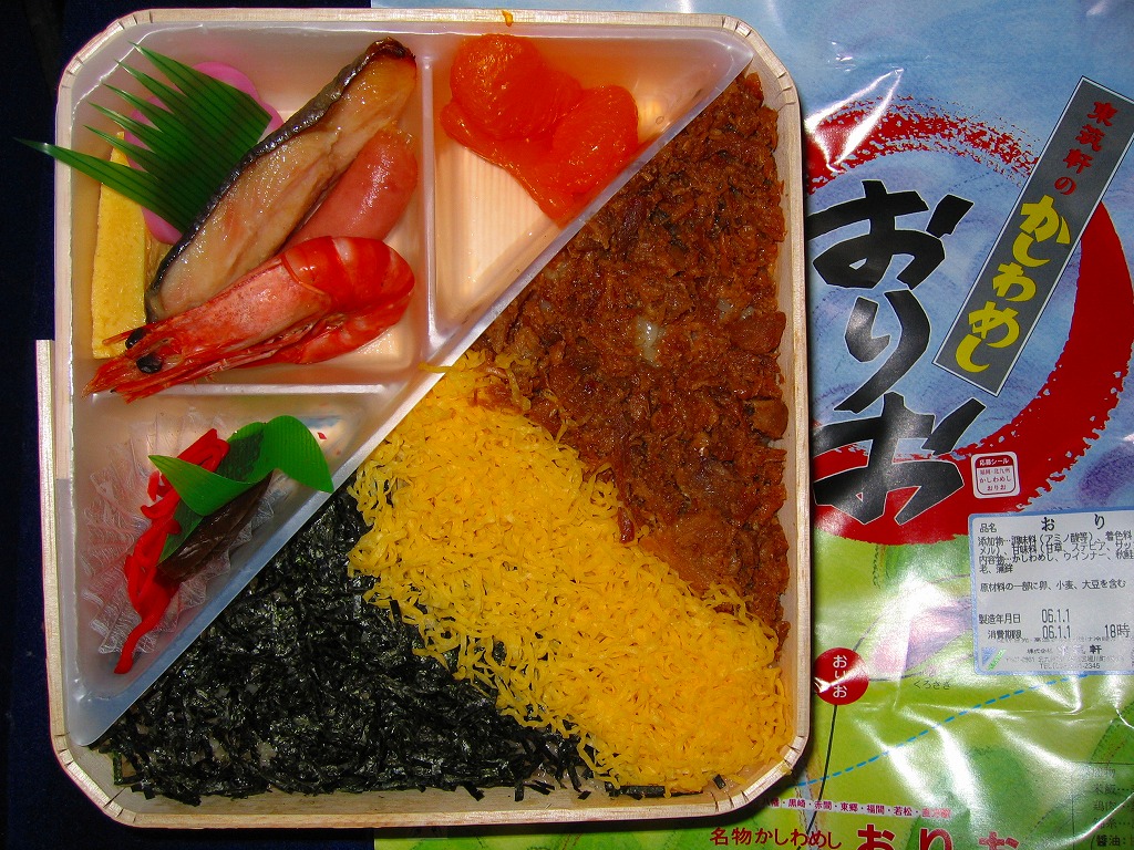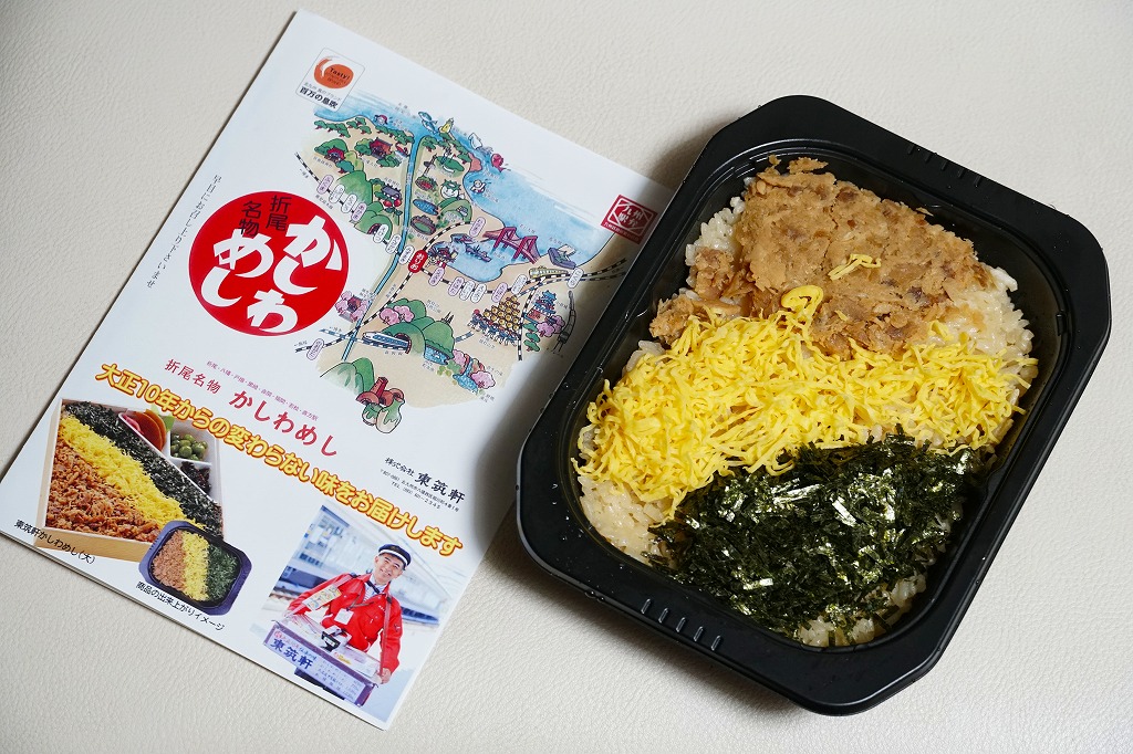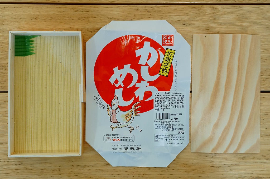 かしわめしの歴史は、大正時代に生まれた駅弁より古い。慶弔用に鶏をつぶして炊込飯等にして振る舞った郷土料理だそうで、この駅弁こそが本来のかしわめしに近いものだと思う。価格は2006年の購入時で4,200円、2007年現在で5,000円、2014年4月の消費税率改定で5,140円、2020年時点で5,200円。2022年3月の値上げでは逆に5,000円へ値下げされ、分量が減ったかどうか気になる。9月の値上げでは価格を据え置き、しゃもじをなくす。2023年9月から5,400円、2024年9月から5,800円。