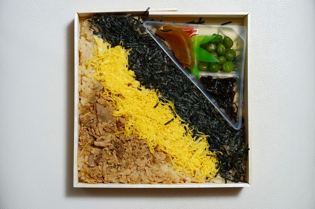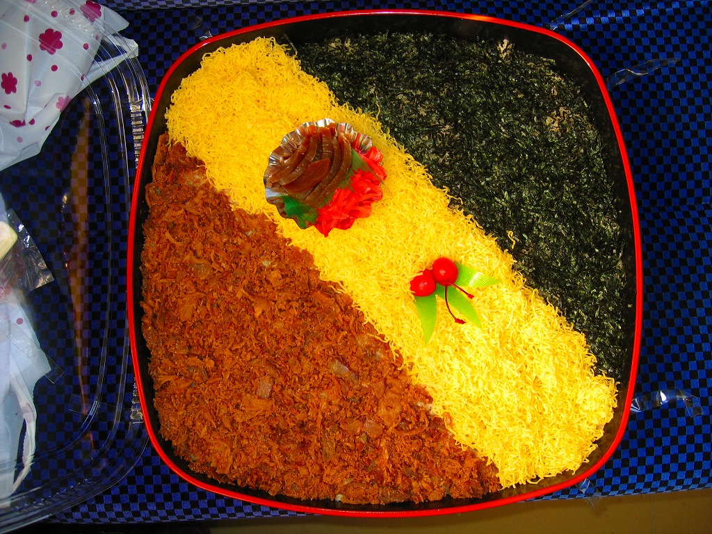 折尾駅弁「かしわめし」の巨大版。予約しなければ買えないが、調製元のチラシなどの商品案内にはその名前と存在が明記され、社内では「かもり」という略称まであるらしい。これは日本一大きな駅弁ではないかと思う。中身が約2,500グラム、総重量は約3キログラム。40.5センチ四方のプラ製容器に、大きな三色のストライプを描いてかしわめしを約3センチ厚でぎっしりと詰め、紅生姜ひとつまみとタクアン約7枚を添えて、2個のさくらんぼで彩る。透明なふたは各所をセロテープで留め、これに割りばし5膳、平皿5枚、ミニしゃもじ1本を付けて、ビニール袋に収納する。