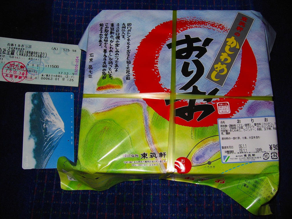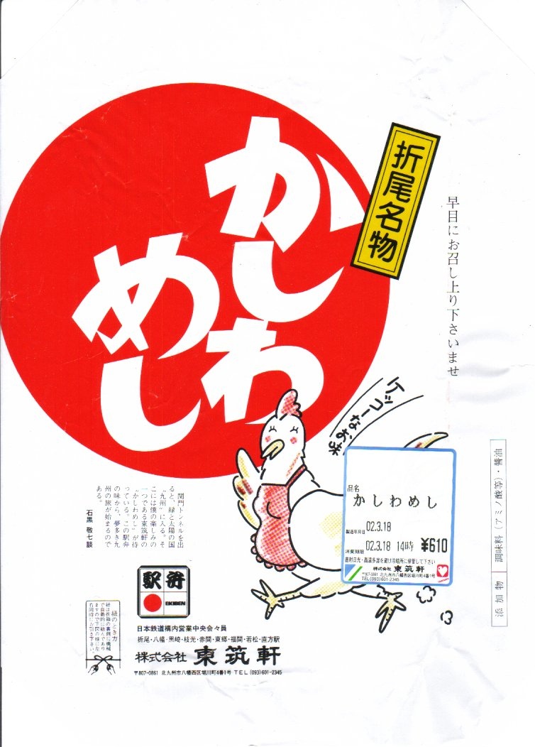 2009(平成21)年1月8日20時の調製である、折尾駅弁の掛紙。京王百貨店の駅弁大会で実演販売されたもので、価格はおそらく750円。下記の2002年のものと、北九州食のブランドのアイコンが増えたことと、販売駅から枝光がなくなったことしか違わない。京王百貨店駅弁大会には常に、折尾のかしわめしの販売要望が多く来ているそうだが、実際に来てみると見た目にほとんど売れず、また来なくなることを繰り返しているように見える。