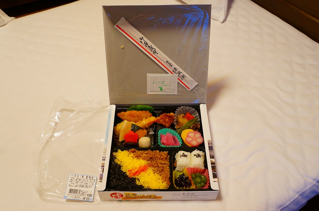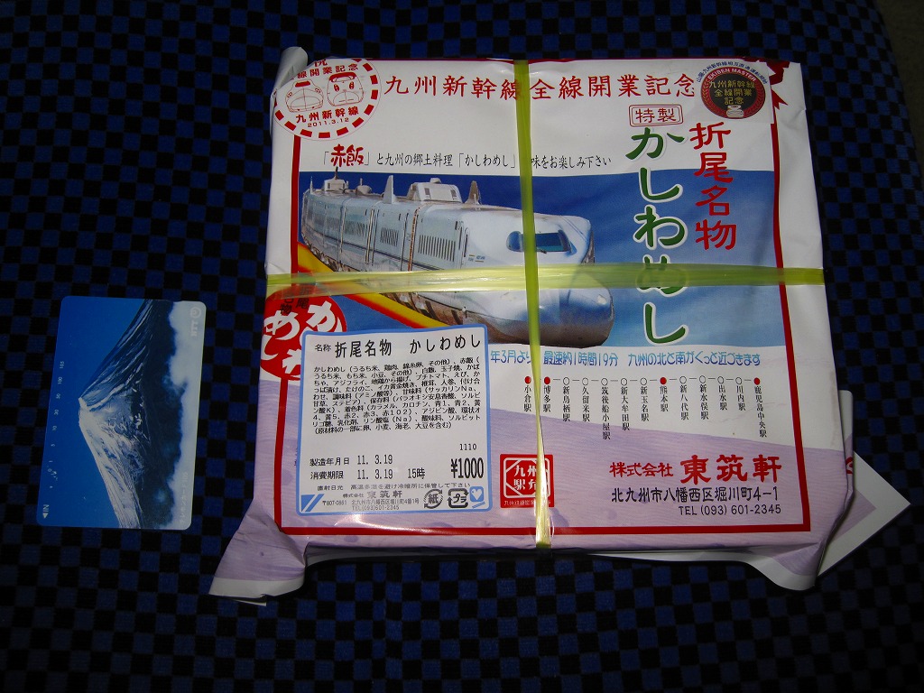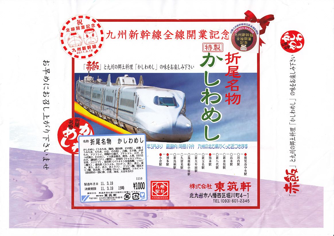 九州新幹線全線開業記念駅弁22種のひとつとして、2011(平成23)年1月1日から8月31日まで販売。平たく四角い木製容器に経木でふたをして、九州新幹線の車両の写真や停車駅に2種のロゴマークを印刷した掛紙で包む。中身はかしわめし、赤飯と白御飯の俵飯、アジフライ、「寿」の焼き印入りの玉子焼、鶏唐揚、プチトマト、イカ黄金焼、カボチャやシイタケなどの煮物など。揚げ物がちょっと小粒かなと思うくらいで、身が詰まり味も締まる、気持ちの良い旅の味。