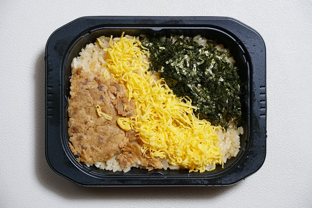 中身は他駅のコロナ禍対策冷凍駅弁とは違い、解凍か加熱でそのまま食べられるものではない。黒いプラ製トレーに薄く敷き詰めた鶏飯と、錦糸卵とかしわ肉と刻み海苔が、合計4袋に渡り個別に密封される。折り畳んだ掛紙の内面が「お召し上がり方」で、自然解凍か電子レンジ利用ののち、自分で盛り付ける手順が示される。