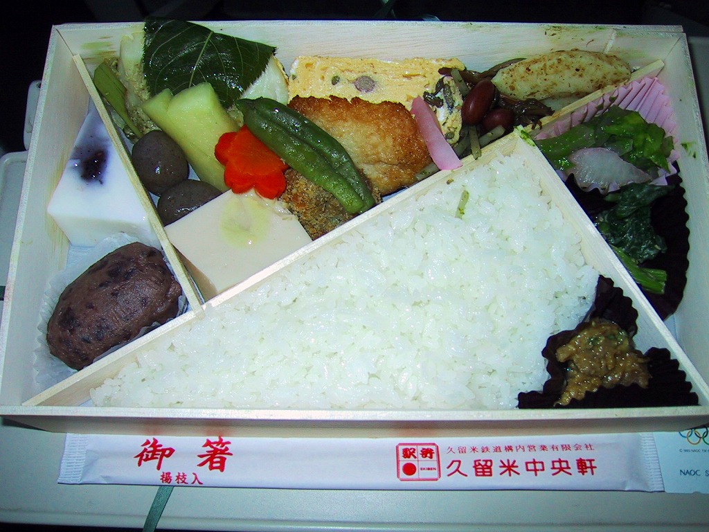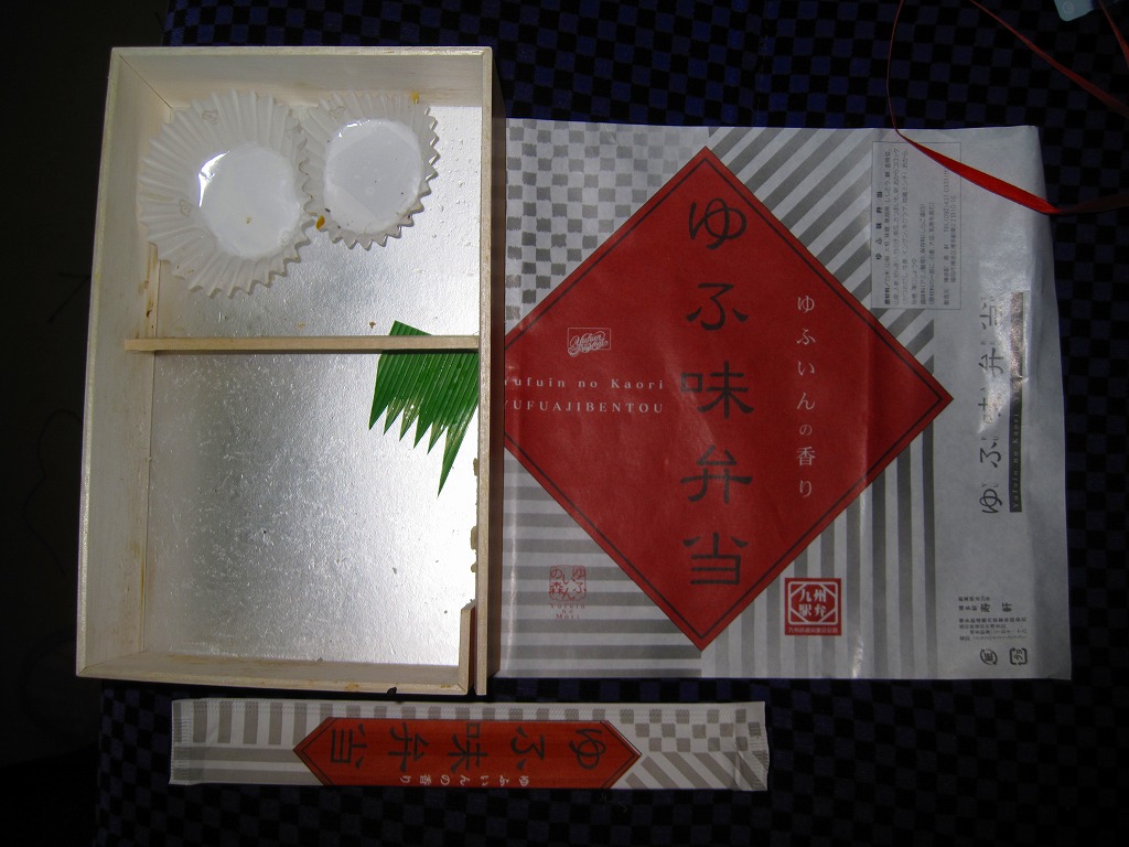 2002(平成14)年3月17日に購入した、車内弁当の包装紙。その絵柄は、キャッチフレーズこそ違えど、上記の2006年のものと変わらない。当時は御飯も白かった。中身はゆふいん産の白御飯、ほうれん草、タケノコ、蓮根、椎茸、ししとう、ぜんまいなど、主に山の幸の食材がひとつひとつ丁寧に調理され、デザートにおはぎと牛乳羹が入った。