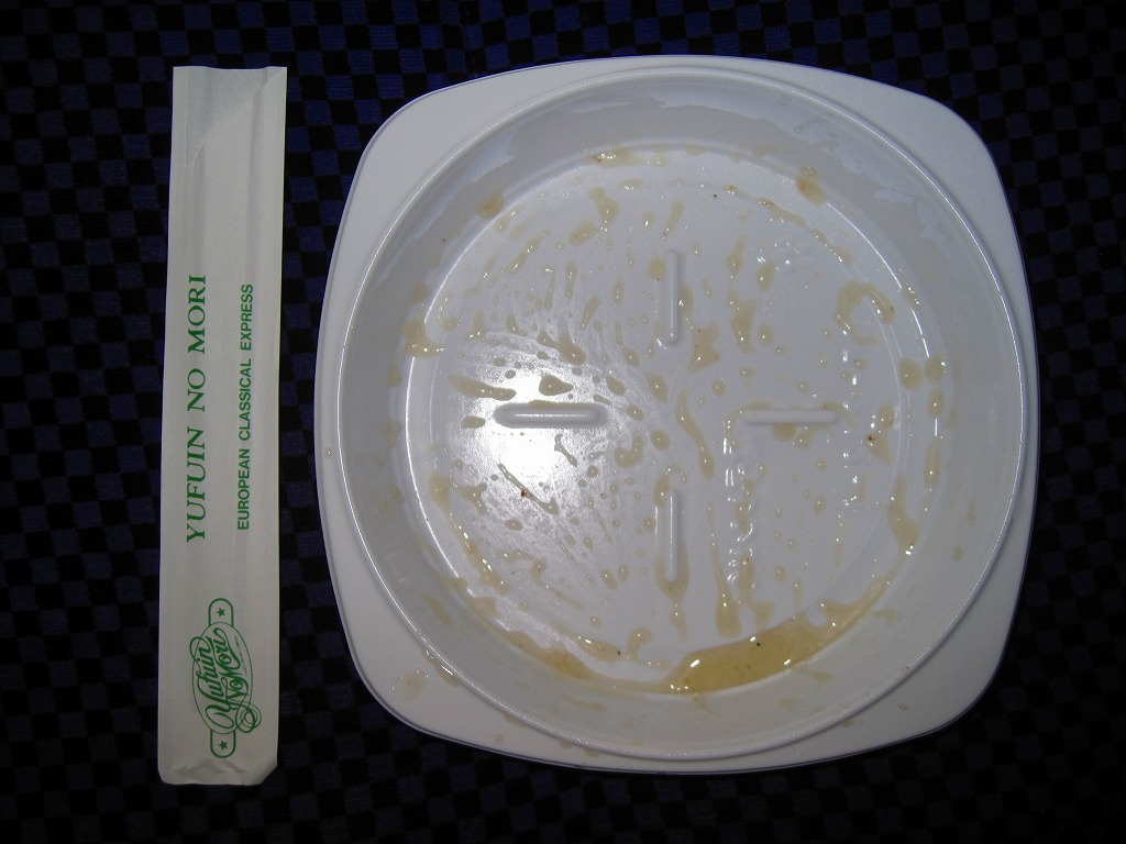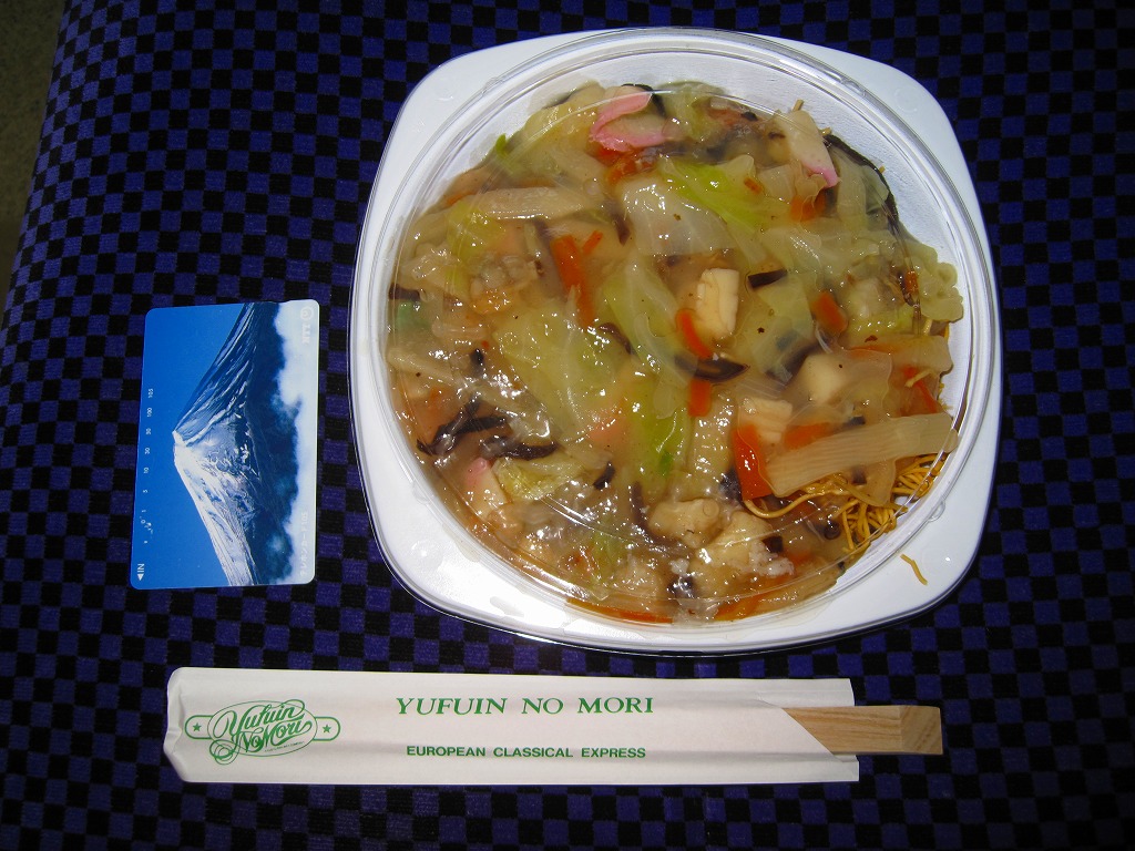 博多駅と由布院駅や大分駅を結ぶ特急列車「ゆふいんの森」のビュッフェで買えた車内調製品。白いプラ製トレーに乾麺を敷き、ハクサイやシイタケやイカやカマボコなどが混ざる電子レンジで加熱のレトルトあんかけをかけたもの。酸味を抑えた、さっぱりした味。