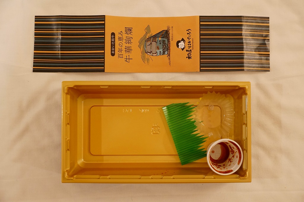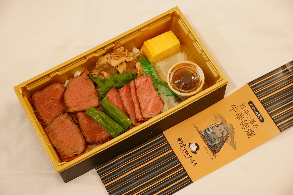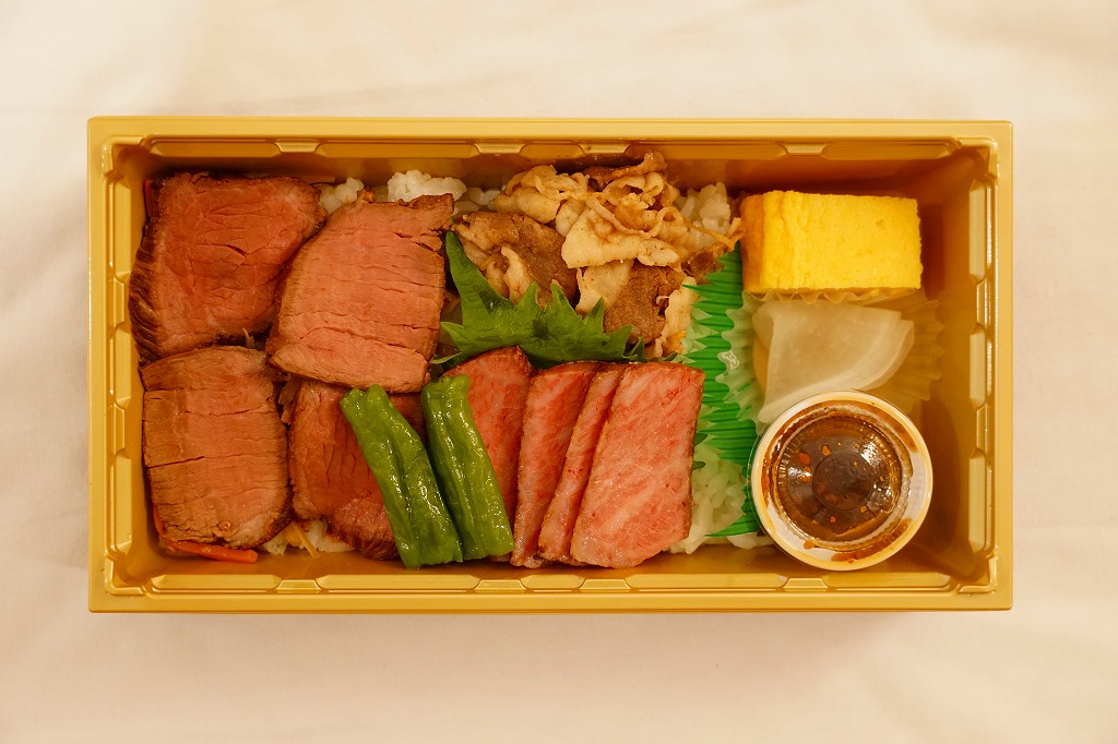 中身は白飯を、大分県のブランド牛「おおいた和牛」のローストビーフ3枚、薄切れ肉、厚切り肉3枚の3種類で覆い、ししとう、焼肉のたれ、玉子焼、甘酢大根を添えるもの。きめの細かい赤身と豊かなサシを持つ牛肉の三様に溜め息が出る。焼肉のたれも特製だろうが、タレがないほうが肉の香りを楽しめると思った。値段にも溜め息。調製元は福岡の飲食店コンサルタントだろうか、JR九州のプレスリリースでは、博多駅や福岡空港にて九州の美味しい食を発信し続けている会社と紹介された。