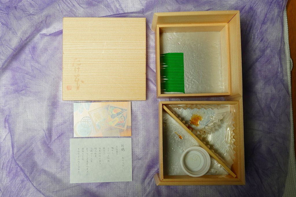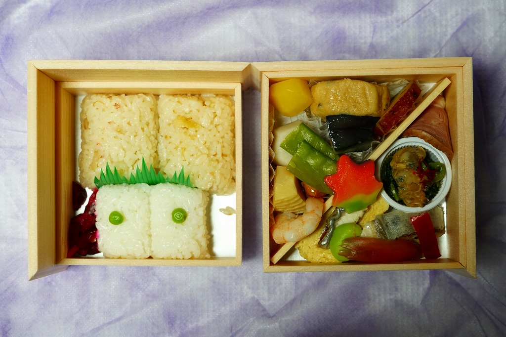 左右に開くギミックを持つ折箱を、和紙風プラの風呂敷で包む。掛紙はとくになく、調製元の名刺大のカードが付いていた。中身は下段に大きな鯛めしと小さなうすい豆御飯の俵飯がふたつずつと柴漬け、上段にお品書きの表現で鰻巻き、旬魚の西京焼、タコの桜煮、合鴨ロース煮、アサリとホウレンソウの煮浸し、酢取りミョウガ、季節野菜の炊き合わせ。一般的な駅弁の雰囲気とは違う、見た目も内容も上質な折詰。2021年までの販売か。