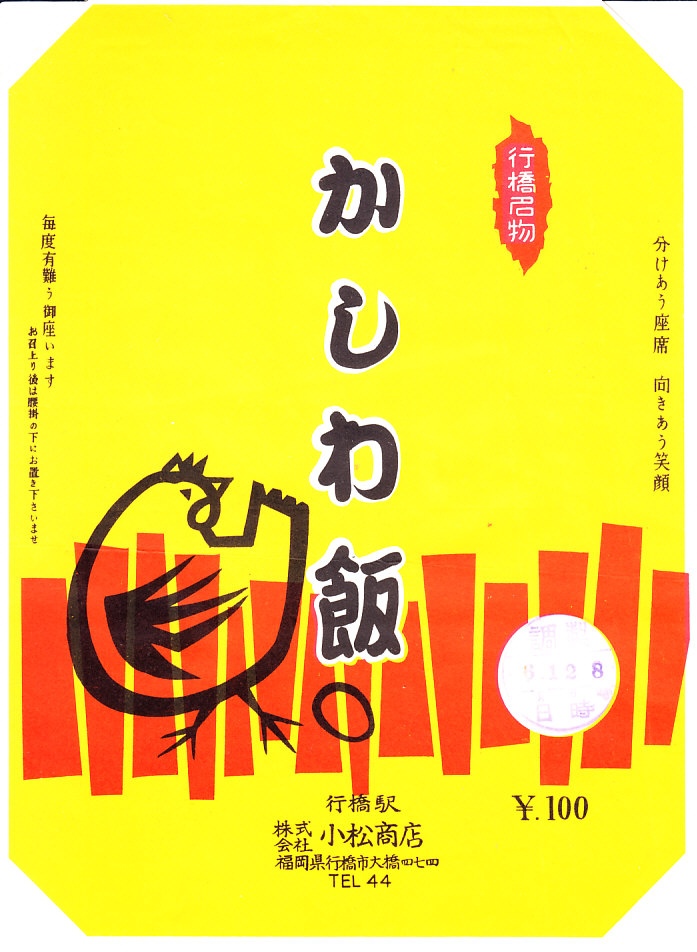 1965年頃の、6月12日8時の調製と思われる、昔の行橋駅弁の掛紙。黄色い掛紙に赤い模様と、ニワトリと卵を描いた。