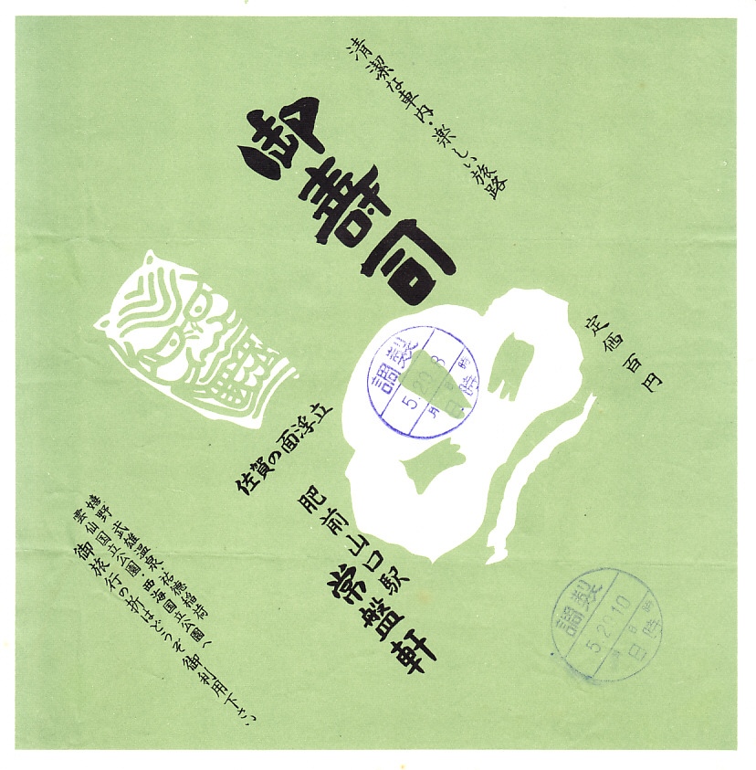 1963(昭和38)年5月29日10時の調製と思われる、昔の肥前山口駅、現在の江北駅の駅弁の掛紙。佐賀の面浮立(めんぶりゅう)という民俗芸能の鬼面が、小さく描かれる。