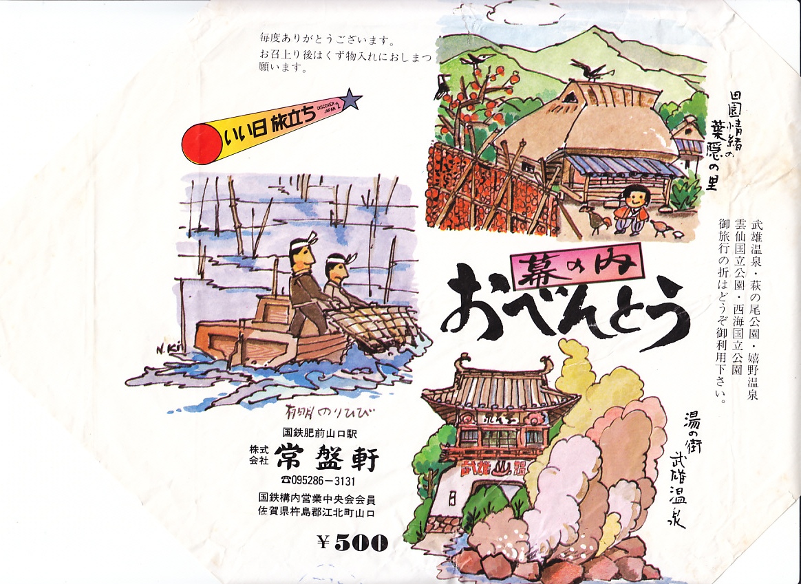 1980年代のものと思われる、昔の肥前山口駅、現在の江北駅の駅弁の掛紙。葉隠の里、有明のりひび、武雄温泉が賑やかに描かれる。当時も今も特急列車「かもめ」「みどり」が行き交う、列車が賑やかな駅であるが、駅弁はひっそり消えてしまった。