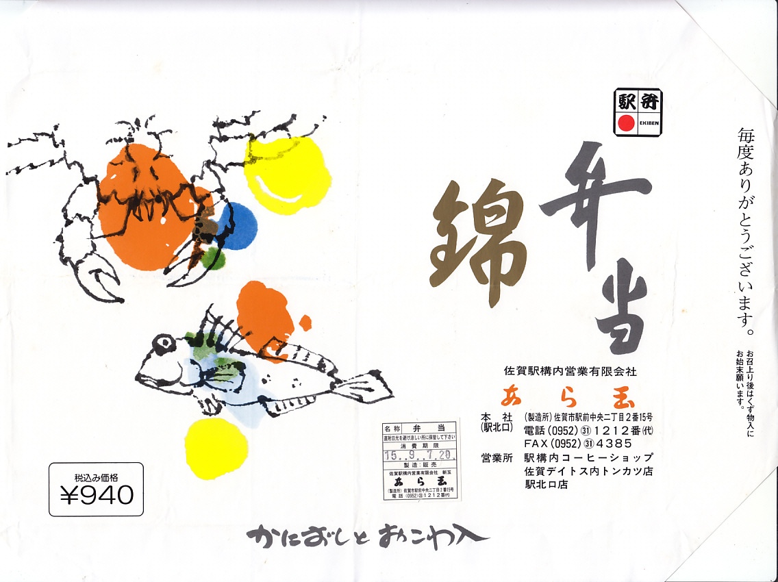 2003(平成15)年9月7日20時の調製と思われる、昔の佐賀駅弁の掛紙。上記の2005年10月や2004年2月に購入したものと、同じ絵柄の掛紙。掛紙に描くムツゴロウは中身になく、カニはある、幕の内タイプの駅弁。