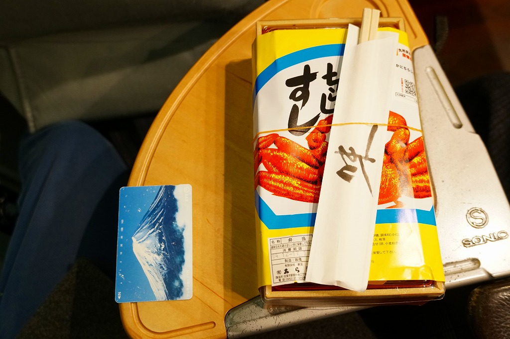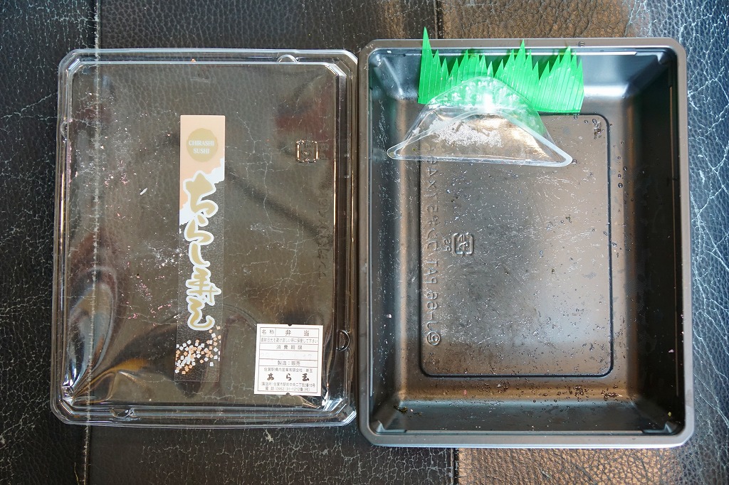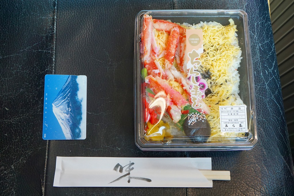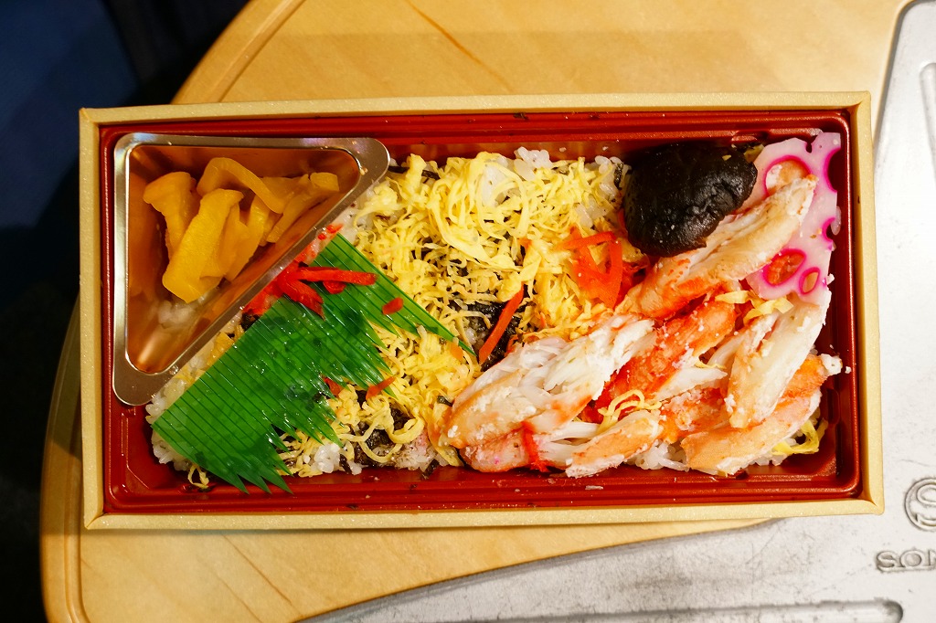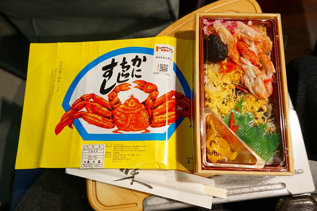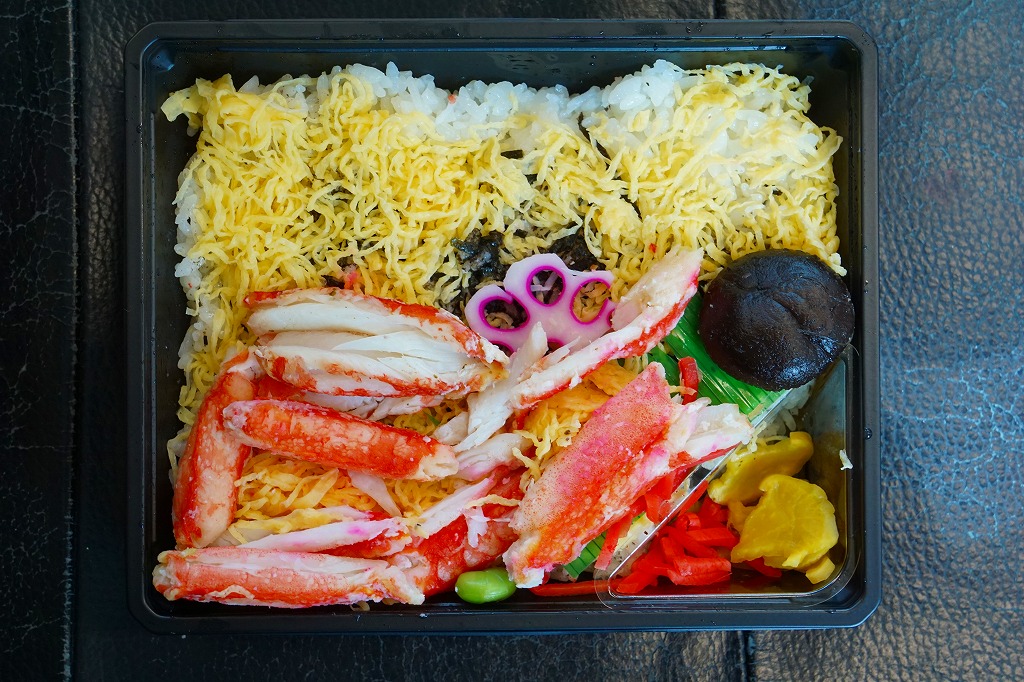 この弁当は内容から判断して、かつての佐賀駅弁「かにちらしすし」の生まれ変わりではないかと思われる。惣菜向けプラ容器に酢飯を詰め、刻み海苔と錦糸卵で覆い、カニ脚肉を載せ、シイタケ、レンコン、紅生姜、たくあんを添える。味もやっぱり「かにちらしすし」で、駅弁であった当時に一部の駅弁ファンを魅了した酢飯の風味が健在だった。