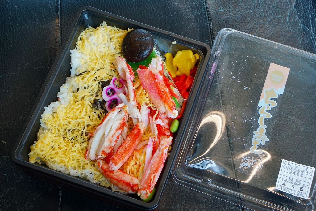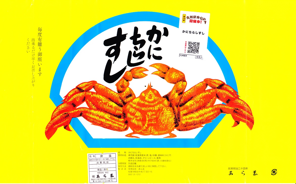 北海道でも北陸でも山陰でもない佐賀に、孤立して存在するカニ駅弁。佐賀県の有明海ではカニ漁もでき、太良町の竹崎カニは名物でもある。そのワタリガニでなくタラバガニに見える立派なカニを描く黄色い掛紙は、昭和時代から変わらないのではと思う。長方形のプラ容器に酢飯を詰め、刻み海苔と錦糸卵で覆い、カニ脚の棒肉を載せ、しいたけ、花れんこん、紅生姜、たくあんを添える。