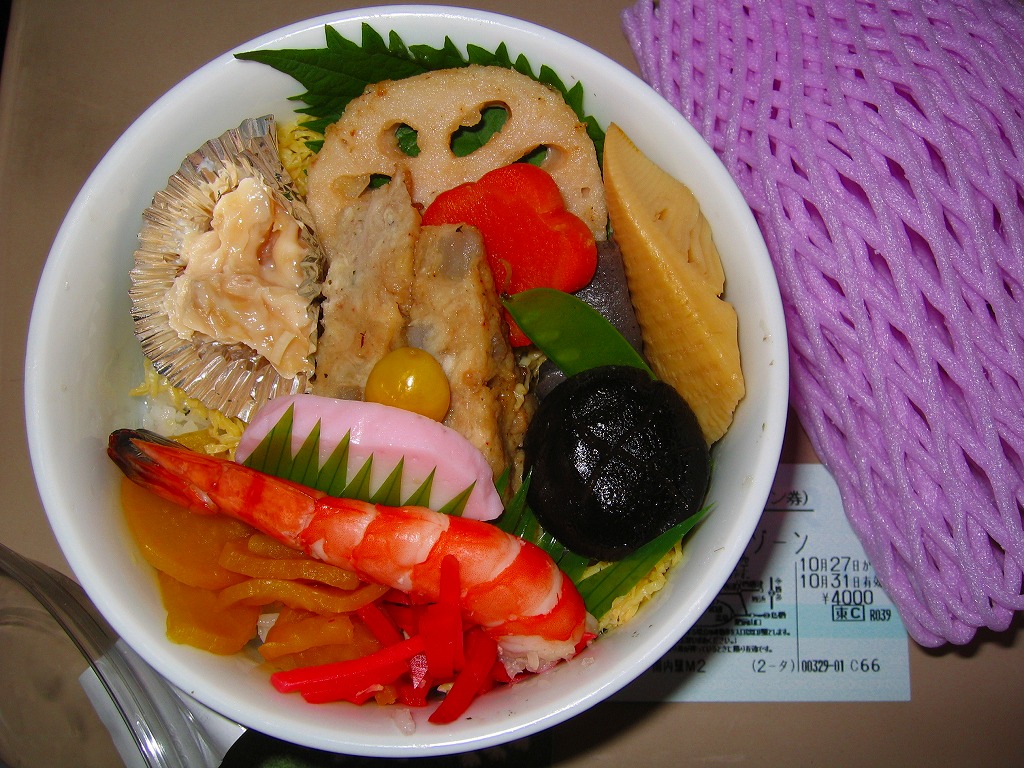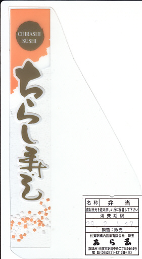 JR九州の駅弁キャンペーン「第1回「あなたが選ぶ、九州の駅弁ランキング!」」の開催に伴い、2004(平成16)年の秋に発売か。海老やレンコン揚げやつくねや煮物などに加えて、時には有明産ムツゴロウ蒲焼など季節物が入ることもあるという、ちらし寿司を詰めた有田焼の器を、果物用の緩衝材で包む。器も具も見栄え良く、地元でも親しまれるその下の酢飯が素晴らしい。