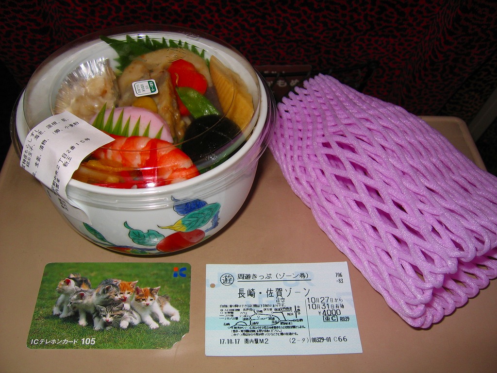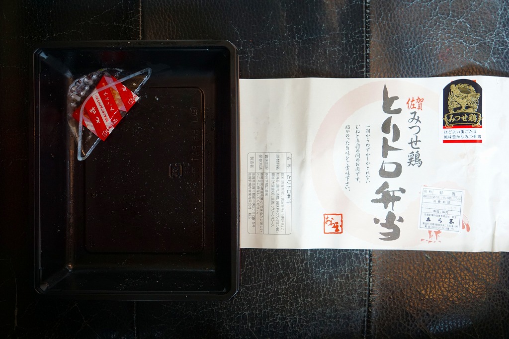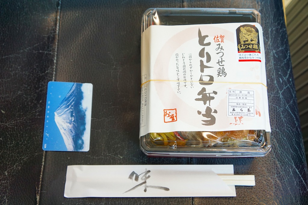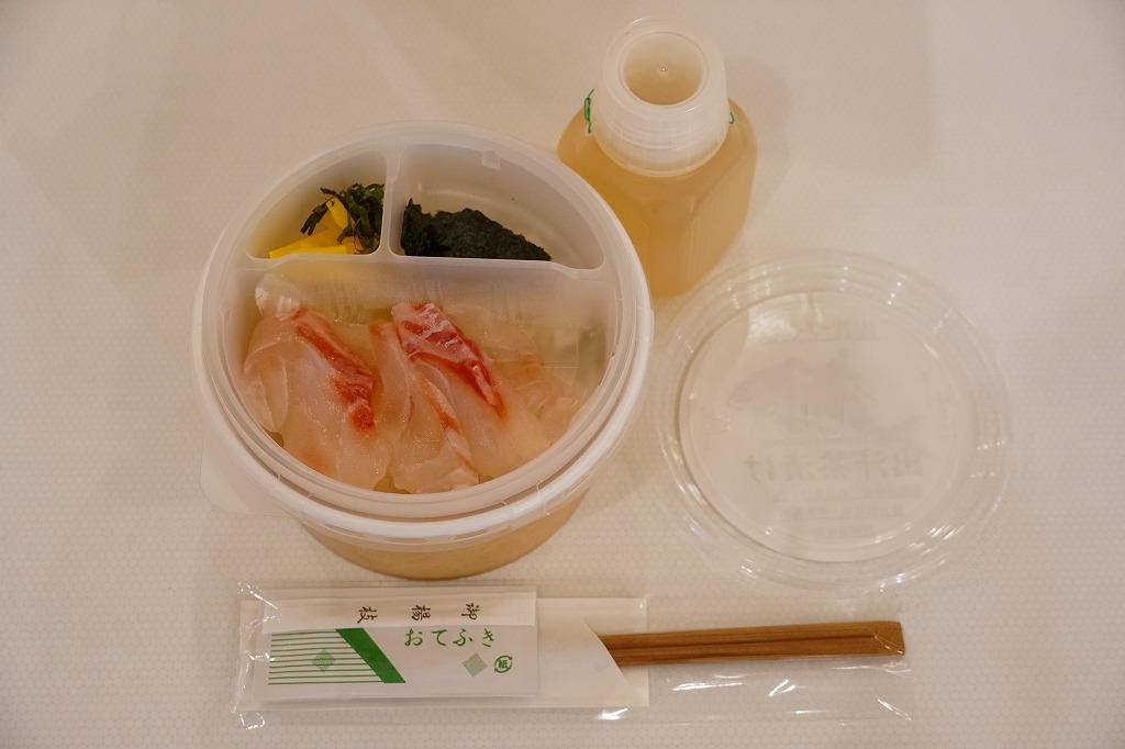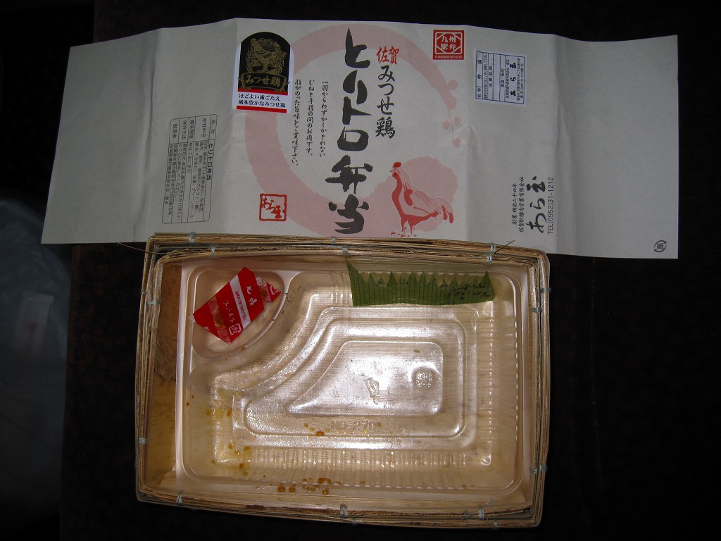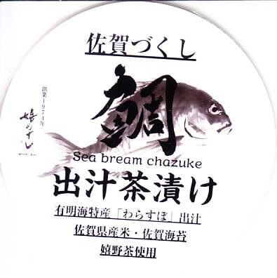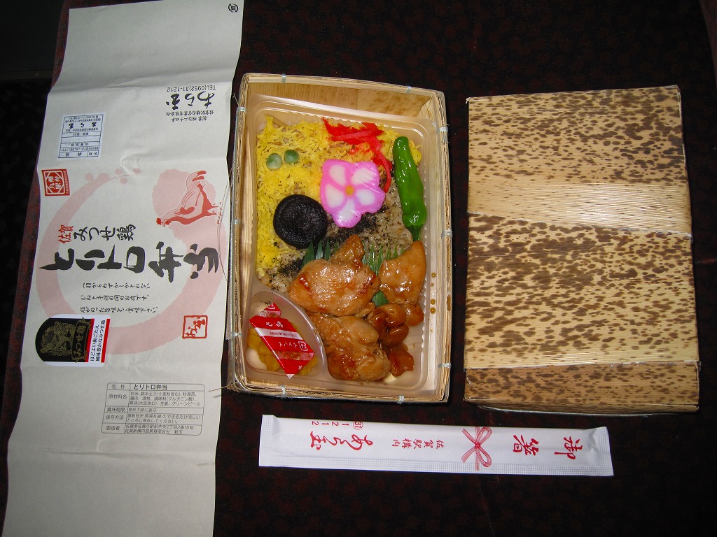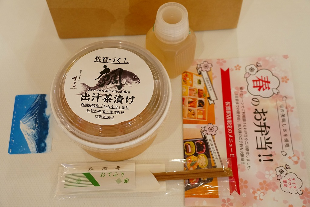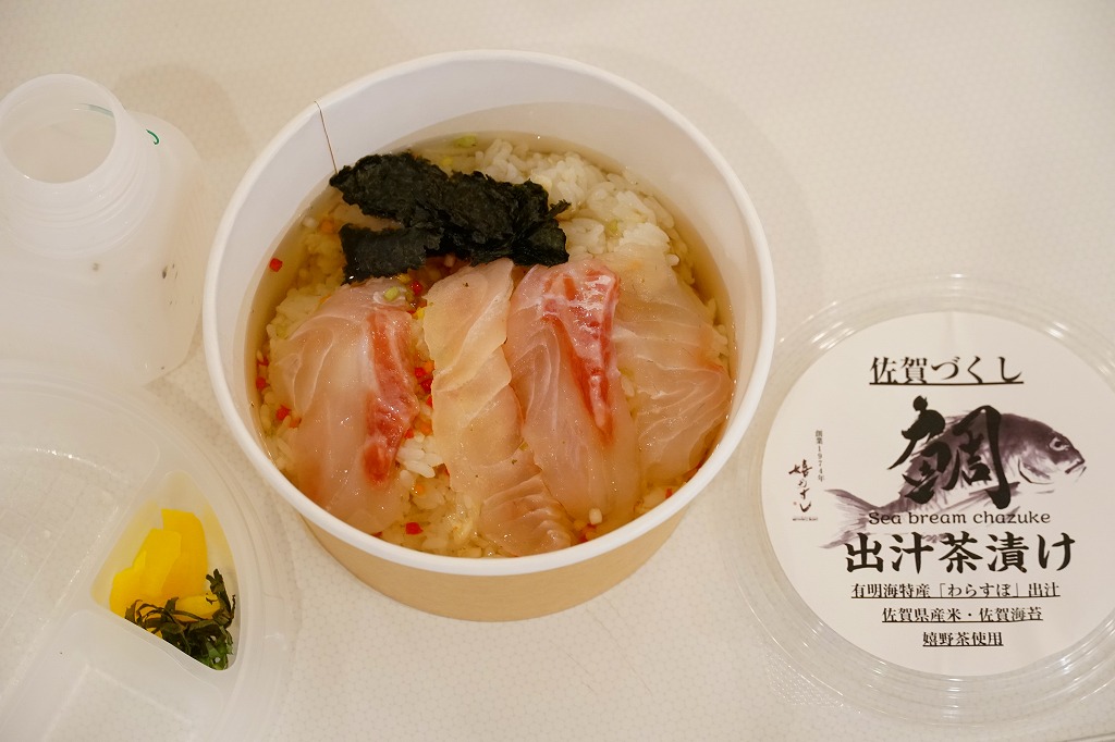 他の駅弁でもまれに使われる耐水紙のカップに、白飯を詰め、あられを振り、タイの切り身と佐賀海苔と漬物を詰めたトレーで覆い、有明海特産「わらすぼ」出汁をポリ容器で添える。まずは御飯にタイを載せて味わい、後はお茶漬けで食べる、名古屋のひつまぶしのような食べ方を推奨。滋味のある冷茶漬けができた。これを佐賀駅の駅弁として客に見てもらえるかどうかはわからない。