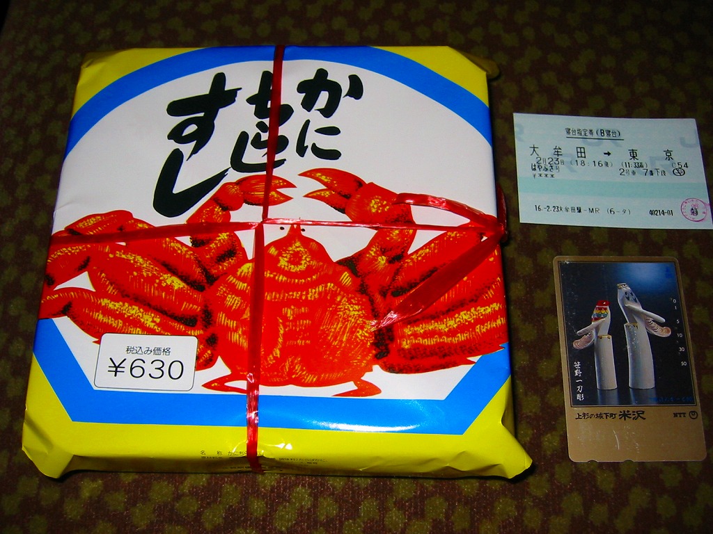 1980(昭和55)年に売り出したという、佐賀駅の幕の内駅弁。2004年の購入当時、幕の内弁当は他にも数種類が売られていたが、掛紙がかかり駅弁らしいのはこれだけ。枠も底もすべて経木の長方形の容器を、カニとムツゴロウを描く掛紙で割りばしごと包み、スズランテープでしばる。中身は紅白の俵飯に佐賀駅弁名物かにちらしずし、おかずは蒲鉾・焼き魚・玉子焼にエビフライやウインナーや竹の子など。おかずの品質に見るべきものはないが、美味い御飯が3種もあることが特徴。