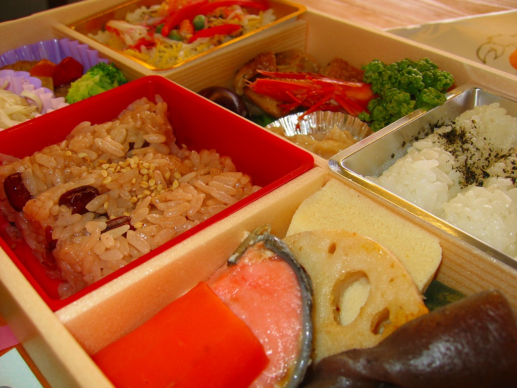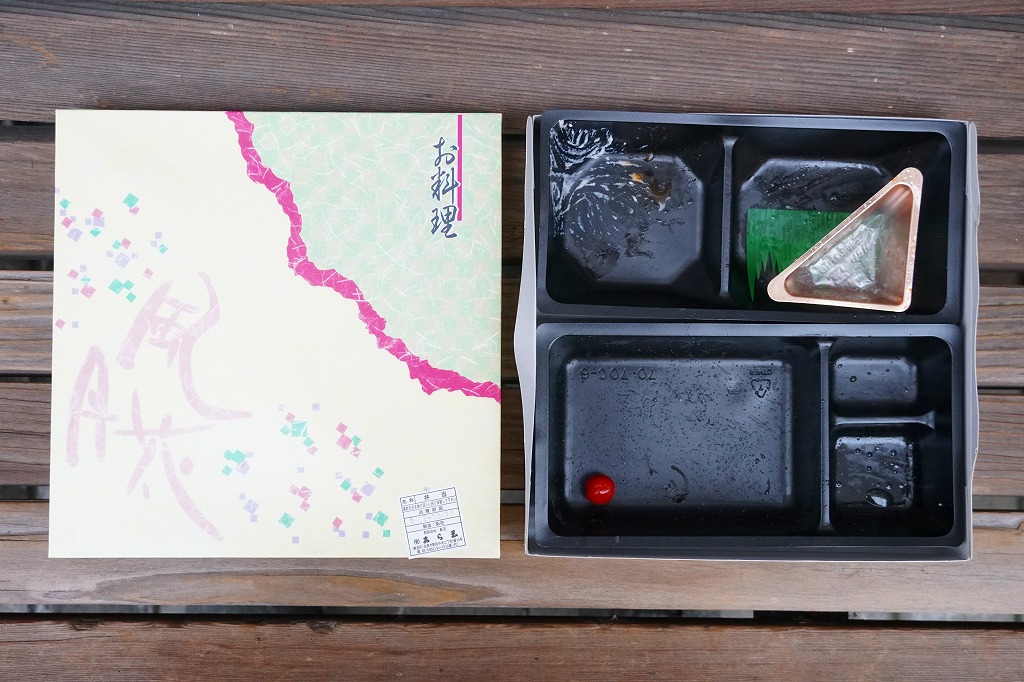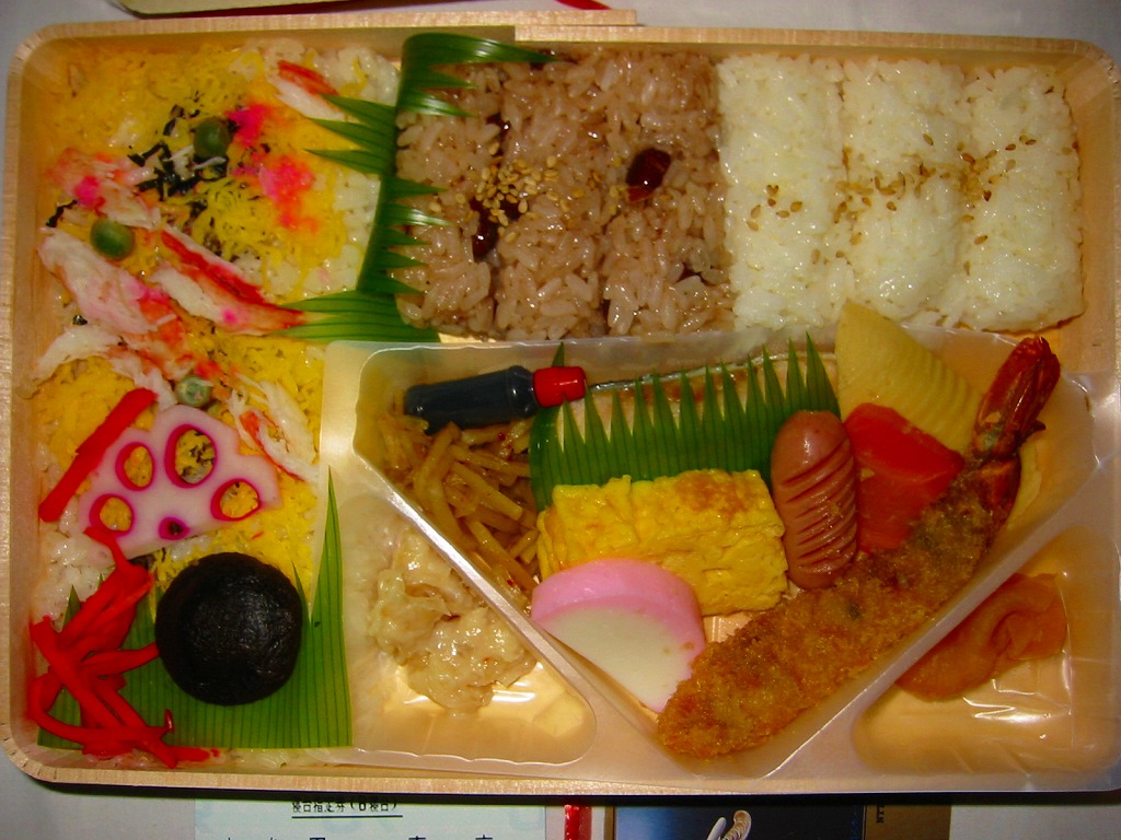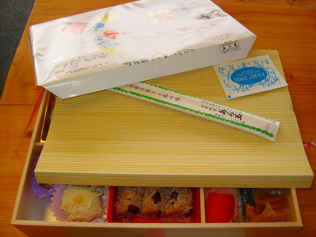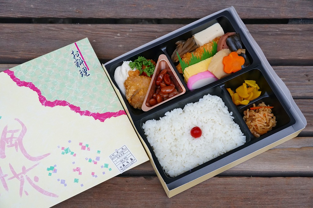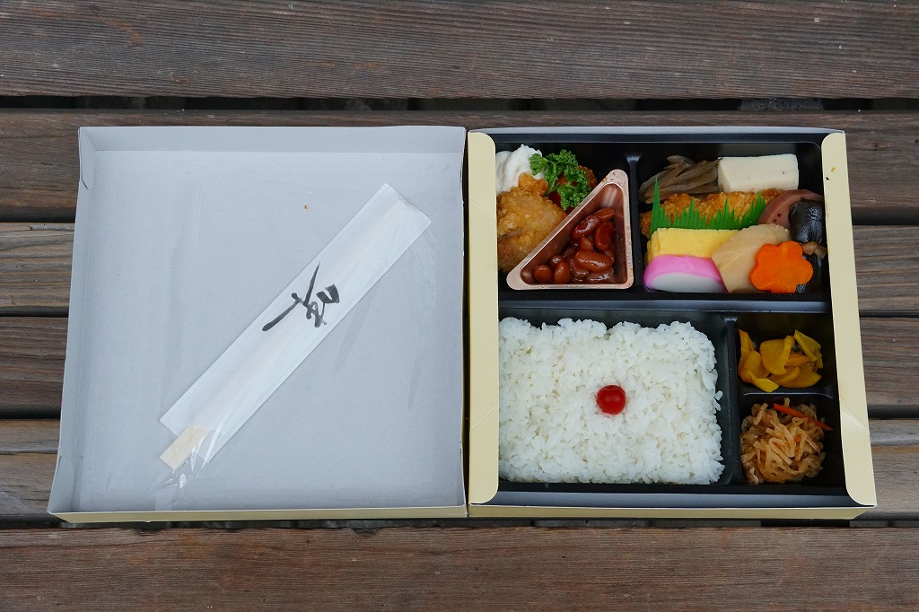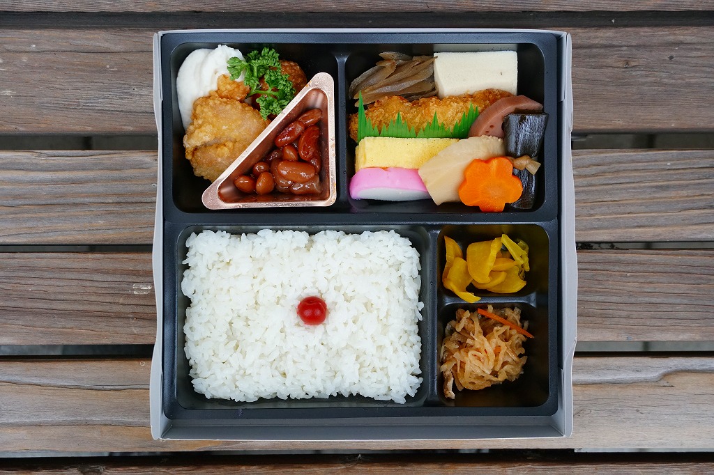 市販の仕出し弁当向け折箱に、日の丸御飯、かまぼこと玉子焼と白身魚フライ、高野豆腐とれんこん、たけのこ、にんじん、昆布の煮物、ささがきごぼう、煮豆、鶏唐揚、肉団子、マッシュポテト、切り干し大根、たくあんを詰める。冷めて食べられる駅弁の特徴は備えており、これは幕の内駅弁だと言い聞かせれば、そう見えなくもない。