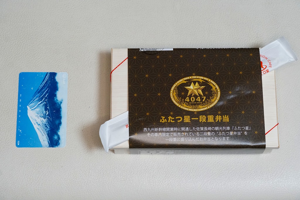車内限定弁当「特製ふたつ星弁当」と「4047弁当」(1,440円)も、同時にデビュー。しかし購入は非常に困難。午前便限定、乗車1か月前から3営業日前までにネット上での予約と決済が必要、予約には座席番号とグーグルかラインのIDが必要なので指定席特急券の事前購入が必要、IDを取るには両社いずれかへの入会と個人情報の提供が必要、その個人情報は予約代行会社を含め共有される。今風のやり方ではあるが、これで詐欺被害に遭ってもきっと自己責任。なぜこんな売り方をするのだろうかと思う。