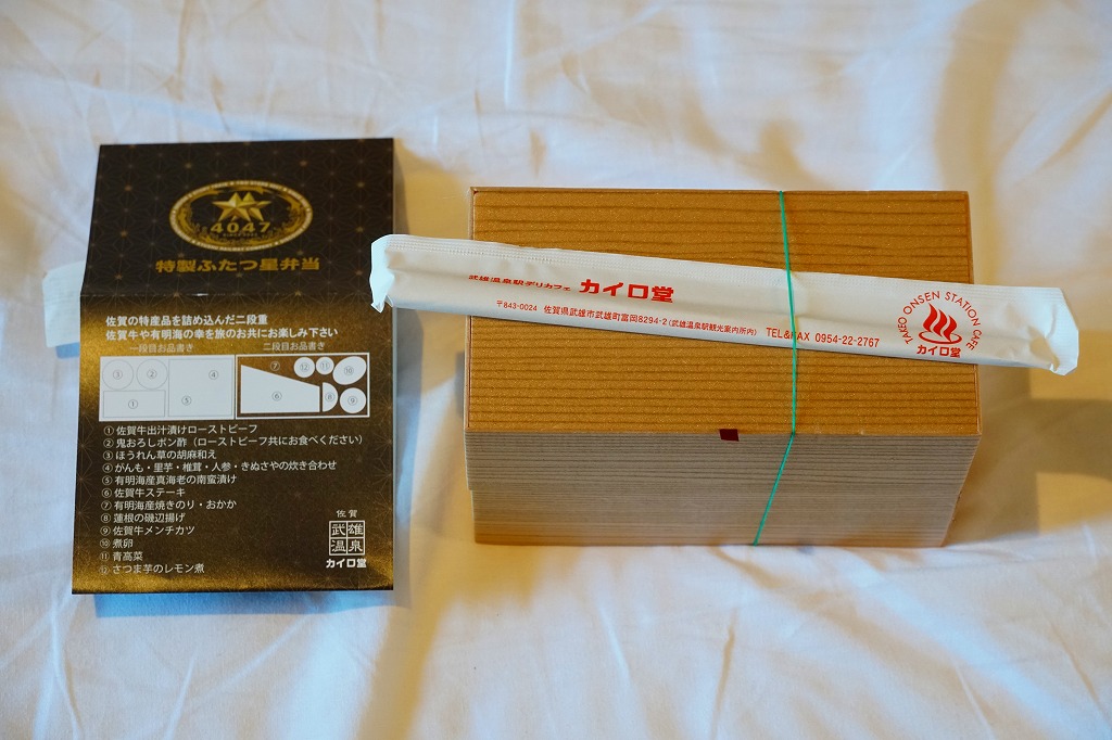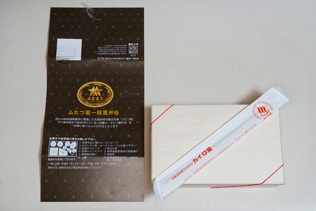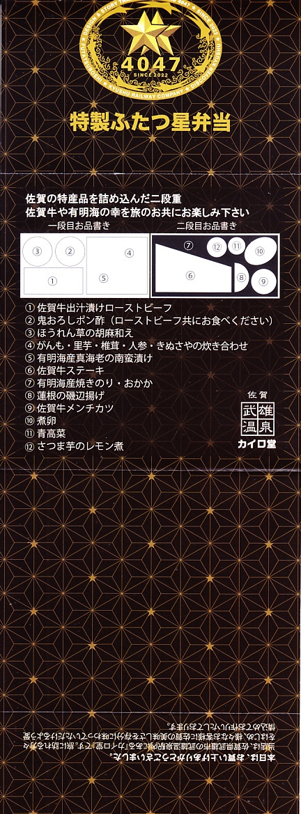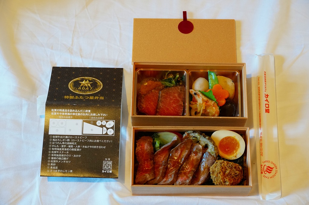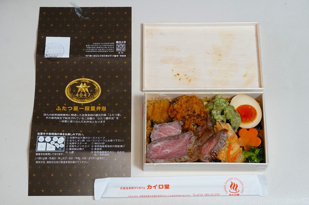 2023(令和5)年1月の、京王百貨店と阪神百貨店と鶴屋の駅弁大会で実演販売。武雄温泉駅の駅弁とも紹介されるが、駅では買えず、予約しても駅では売ってもらえない、2022年9月運転開始の観光列車「ふたつ星4047」の列車内で、事前の予約にて購入できる車内弁当「特製ふたつ星弁当」(2,520円)の、二段重を一段重に盛り込んで、目玉商品のひとつとして三大駅弁大会で販売したもの。調製元は武雄温泉駅で「佐賀牛すき焼き弁当」など人気の駅弁を売る駅弁屋。