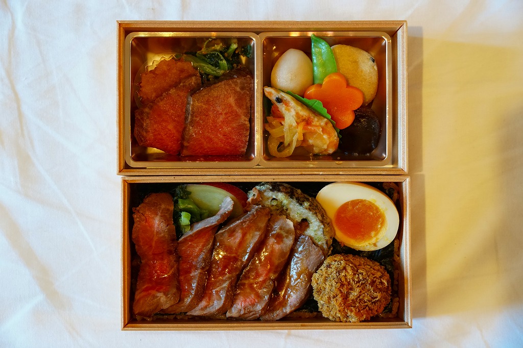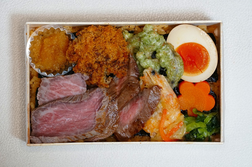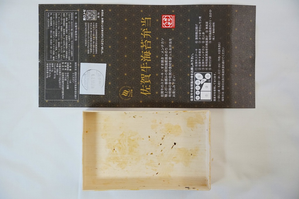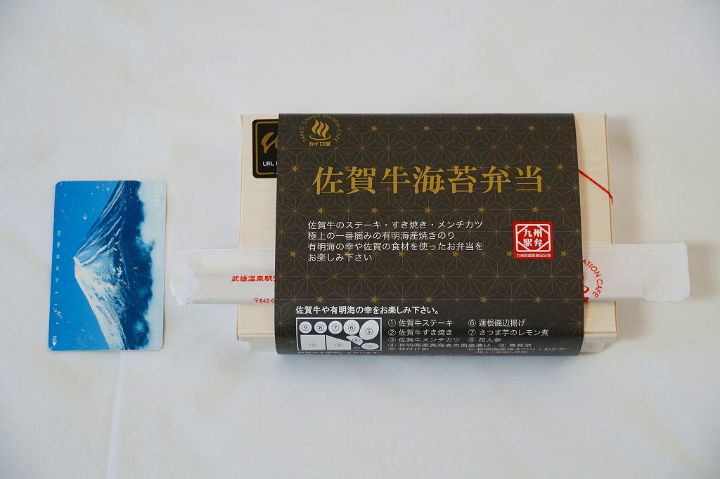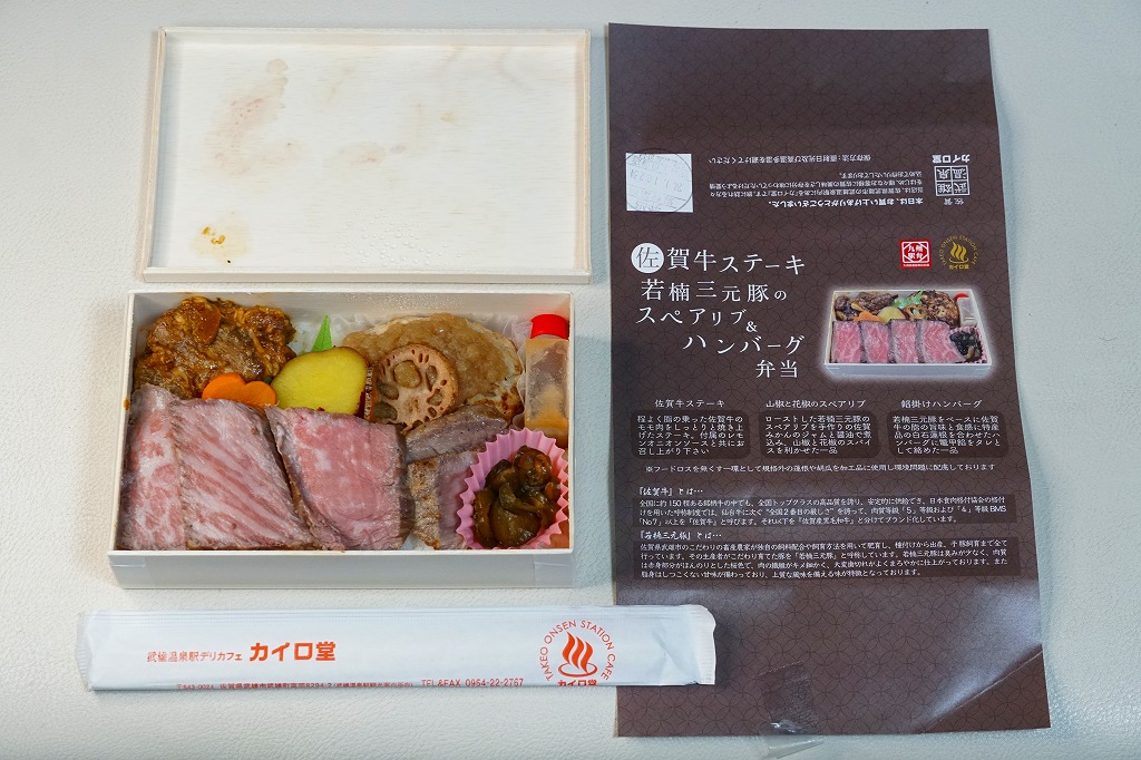 小柄な長方形のプラ容器を二段に重ね、観光列車のロゴマークとおしながきを記した黒いスリーブで留める。中身は下段がステーキ丼で、白飯を有明海産焼きのりとおかかで覆い、佐賀牛ステーキを載せ、佐賀牛メンチカツ、蓮根の磯辺揚げ、煮玉子、サツマイモを添えるもの。上段がおかずで、佐賀牛のローストビーフと鬼おろしポン酢、里芋や椎茸などの炊合せ、有明海産真海老の南蛮漬け、ほうれんそうの胡麻和え。調製元の武雄温泉駅弁と同じく、上質でおいしいステーキ丼。