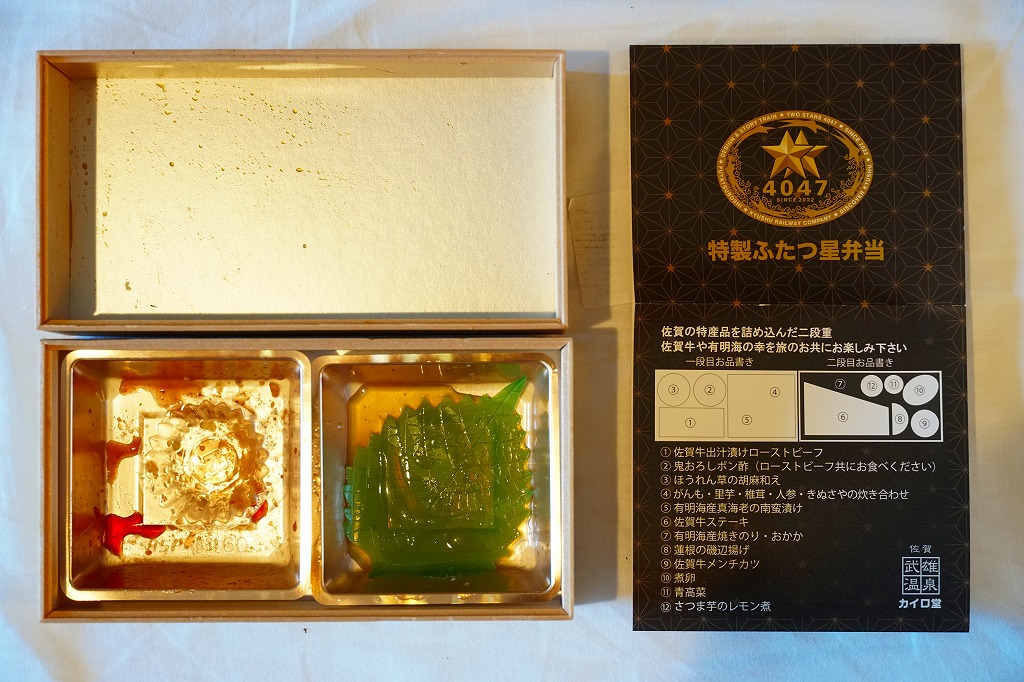 2022(令和4)年9月23日の西九州新幹線の開業日に、佐賀県と長崎県で運転を開始した観光列車「ふたつ星4047」の列車内で、事前の予約にて購入できる車内弁当。ここでは2023年1月の阪神百貨店の駅弁大会で実演販売されたものを買えた。併売した上記の催事向け模造品「ふたつ星一段重弁当」と違い、こちらは現地の現物と同じものが買えるということで、開店時から行列の人気だった。