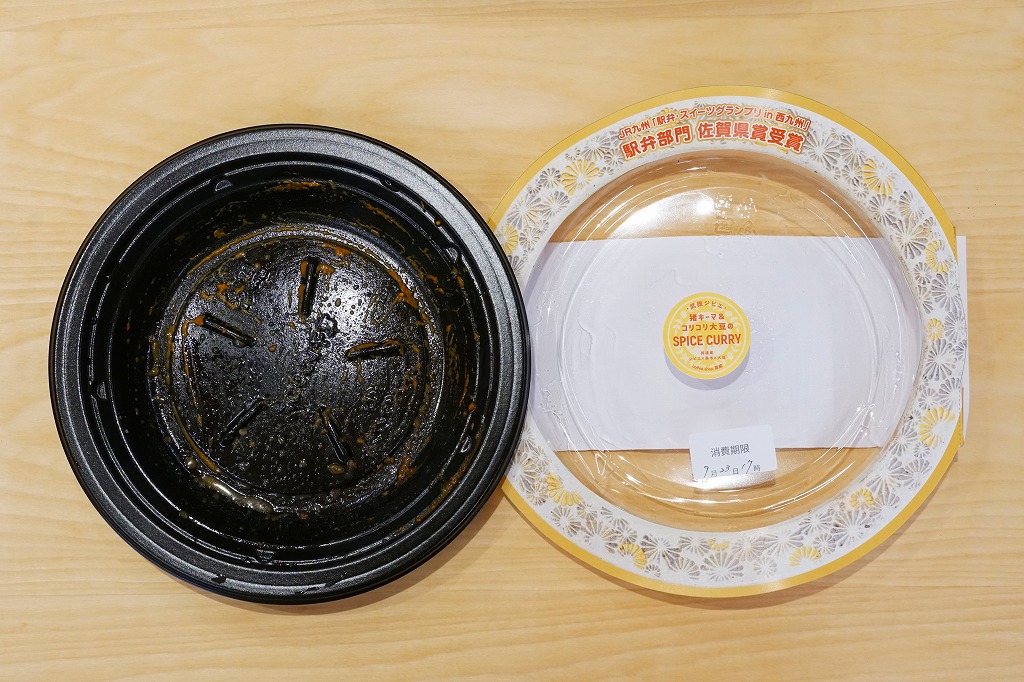 惣菜向けの丸いプラ製の平皿に、黒米混じりの御飯を据え、どろどろのカレーとキーマカレーをかけ、ゆで卵、トマト、ほうれんそう、にんじん、キャベツ漬を添えたもの。佐賀県や武雄温泉駅がどこにあるのか分からなくても、これはおいしくて美しいカレーライス。販売の事実もまた、誰も紹介することなく、年末の再訪では消えていた。既存の「佐賀牛すき焼き弁当」が強い武雄温泉駅では、もう二度と売られることはないだろうが、調製元の武雄温泉元湯に近いカフェでは、2021年新発売のメニューとして、注文できるのではないかと思う。