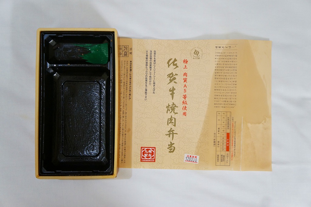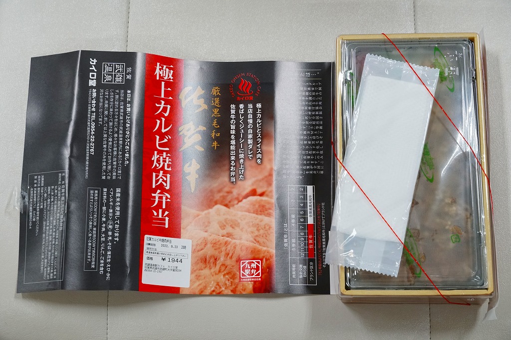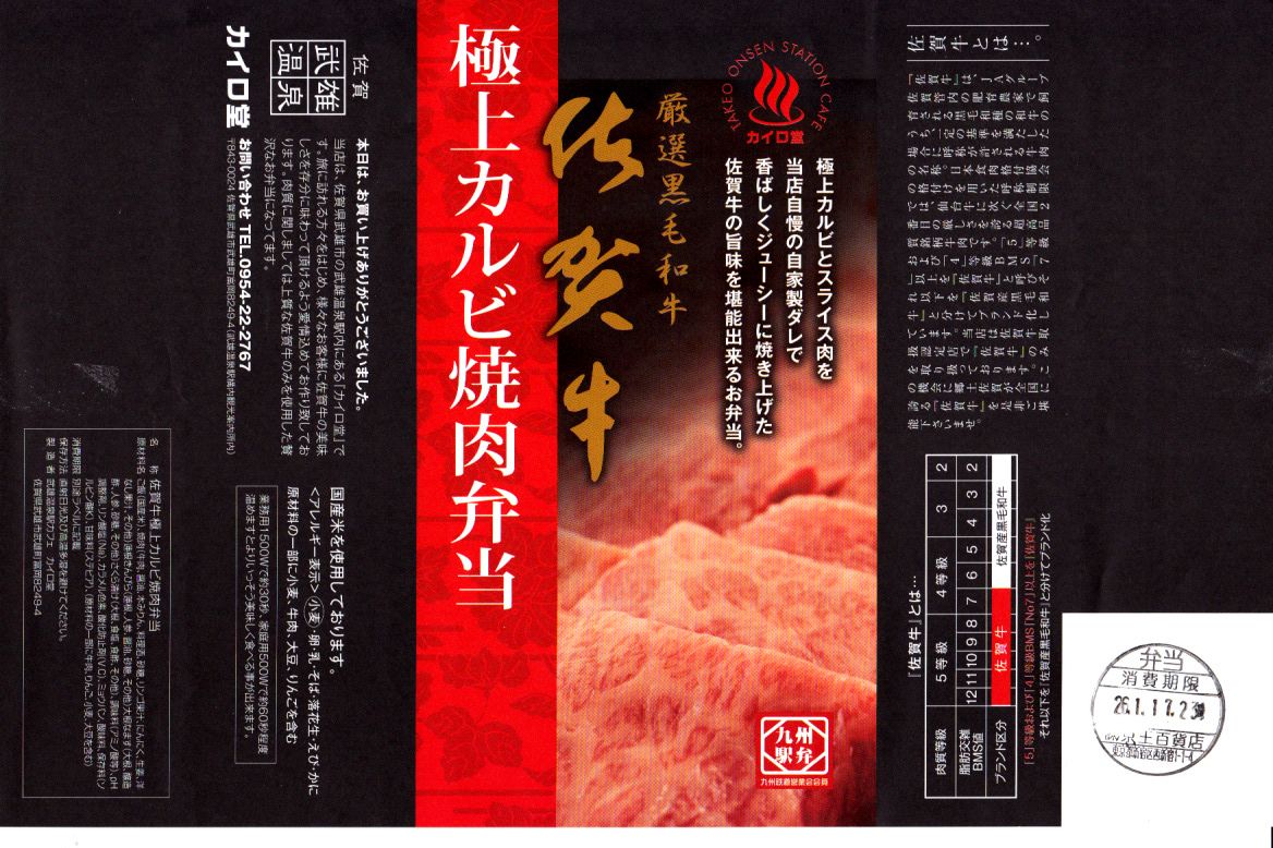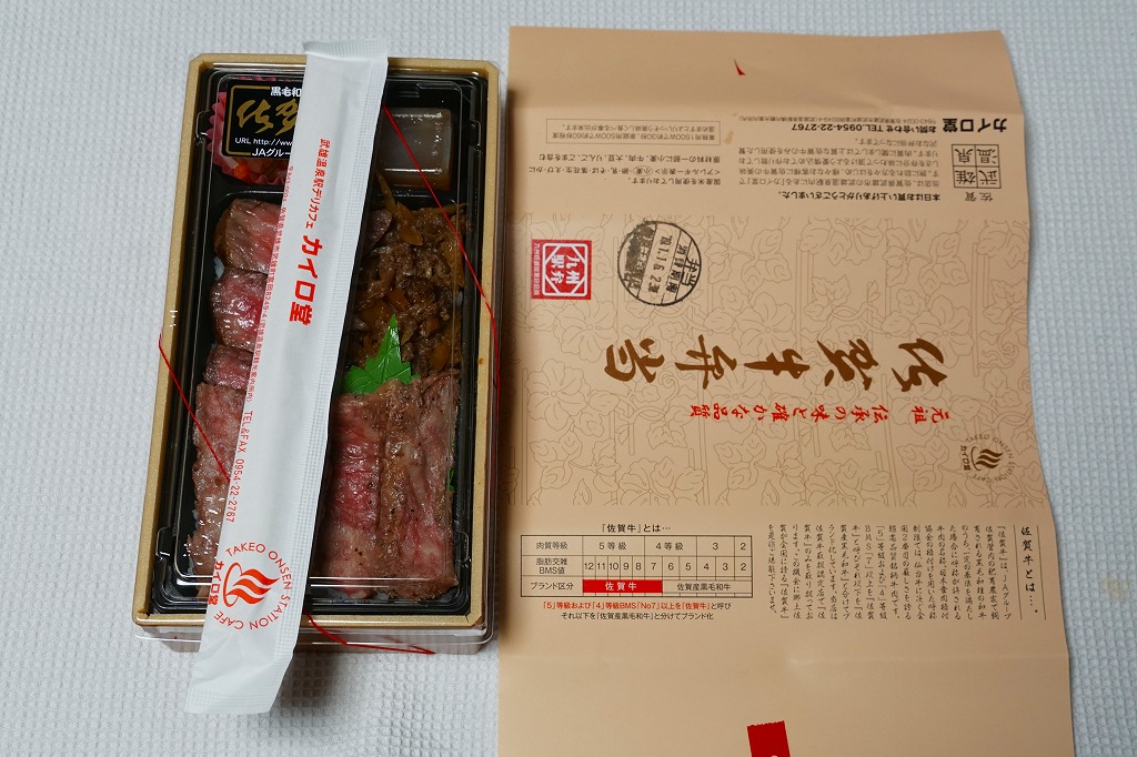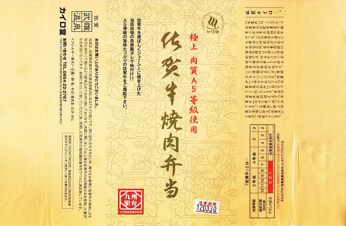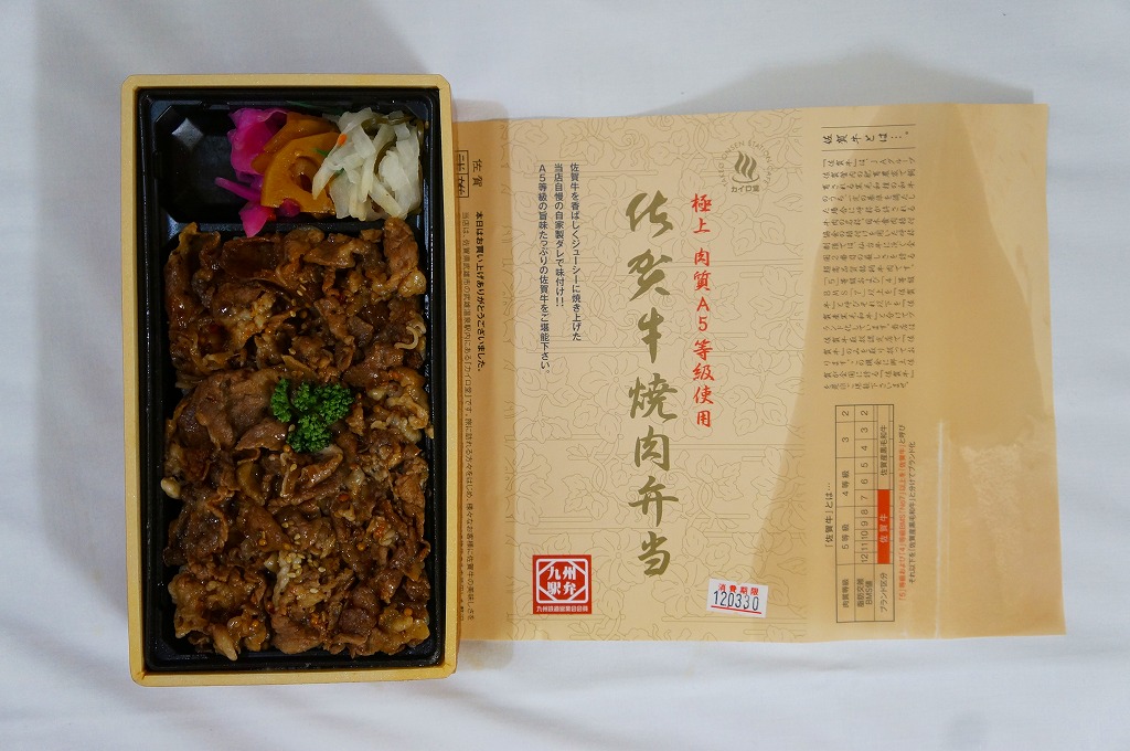 2012(平成24)年度のJR九州の駅弁キャンペーン「九州駅弁グランプリ(第9回)」へのエントリーに向け、同年10月までに発売。翌2013(平成25)年度の同キャンペーンにもエントリーされ、そこで優勝した。武雄温泉駅の他の駅弁とは違い、牛肉の写真を美しく載せた黒い掛紙を使う。容器は共通で、中身も牛肉以外は同じ。駅弁の名前のとおり、白御飯を佐賀牛の極上カルビとスライス肉の焼肉で覆う。上で何度も書いているが、常温にしても駅弁として美味すぎる焼肉弁当。価格は2012年の発売時で1,575円、2017年時点で1,620円、2019年時点で1,944円。