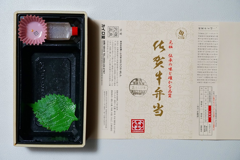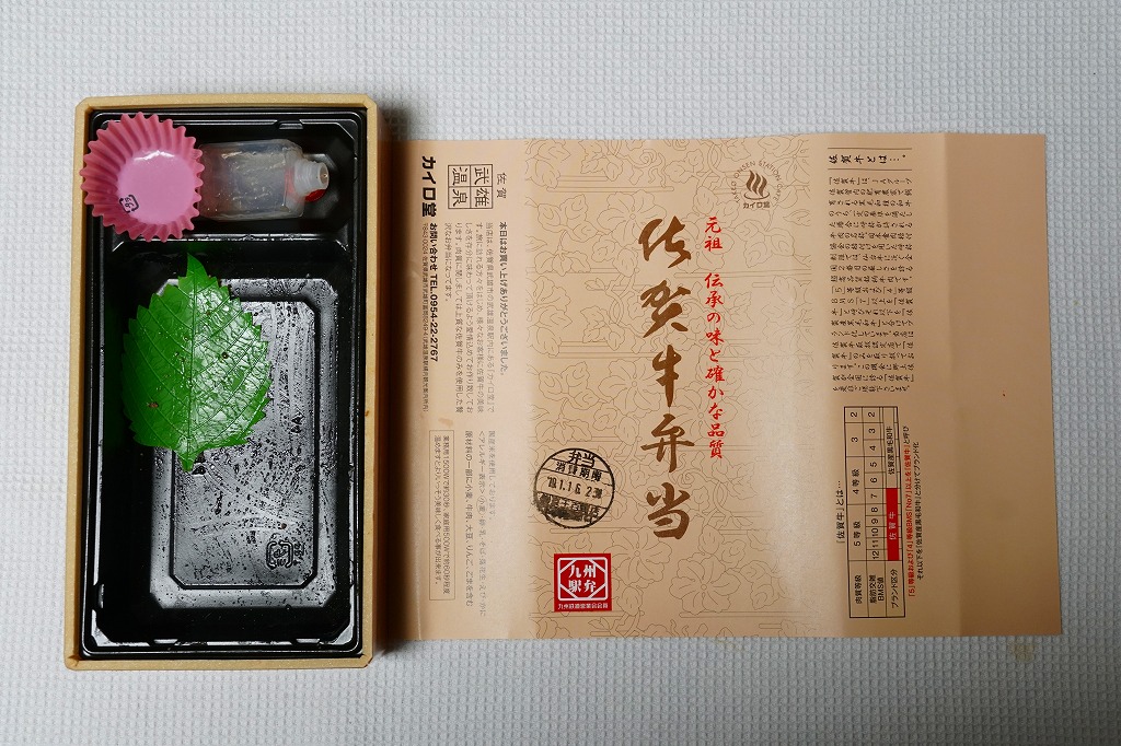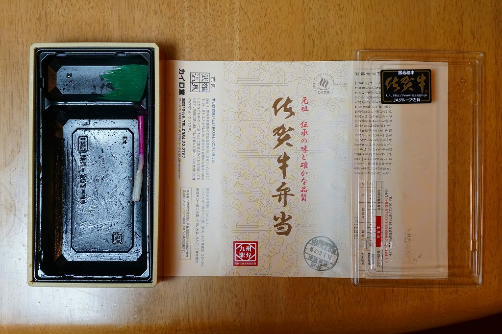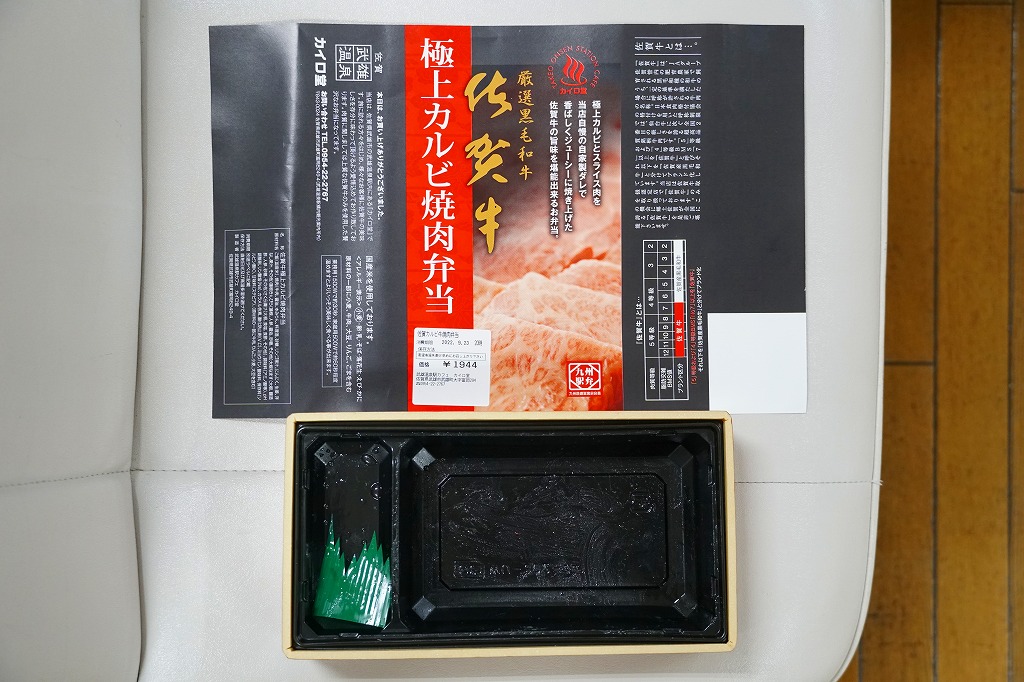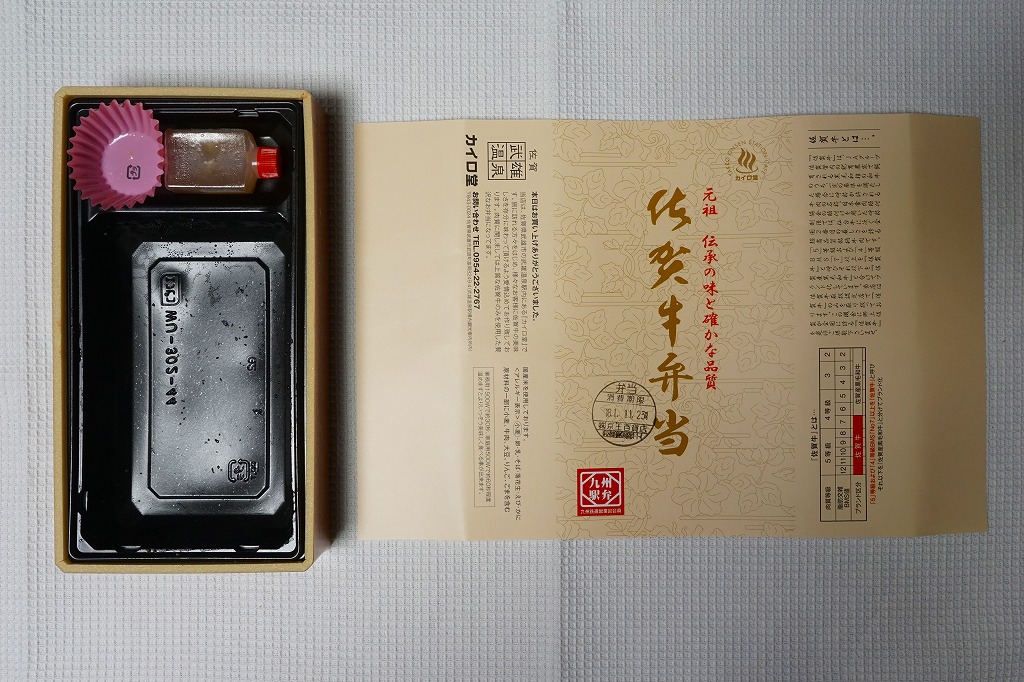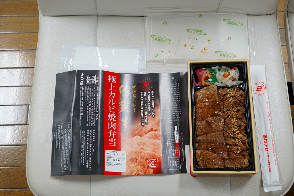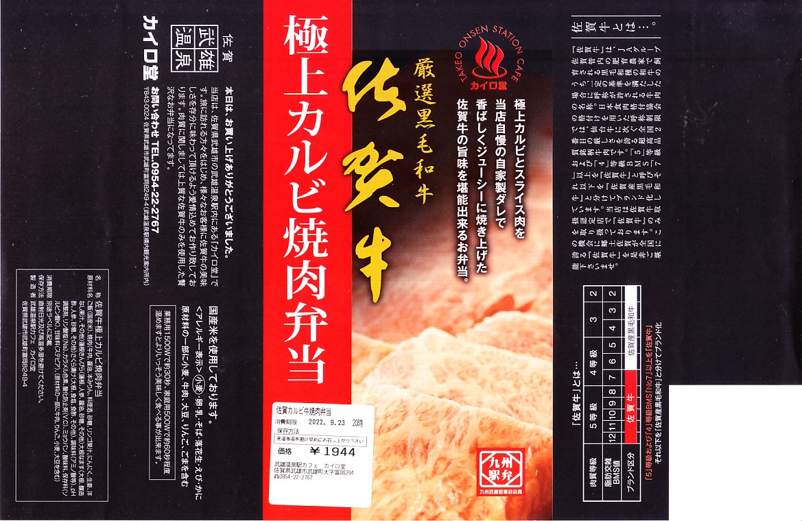 2012(平成24)年度のJR九州の駅弁キャンペーン「九州駅弁グランプリ(第9回)」へのエントリーに向け、同年10月までに発売。翌2013(平成25)年度の同キャンペーンにもエントリーされ、そこで優勝した。武雄温泉駅の他の駅弁とは違い、牛肉の写真を美しく載せた黒い掛紙を使う。容器は共通で、中身も牛肉以外は同じ。駅弁の名前のとおり、白御飯を佐賀牛の極上カルビとスライス肉の焼肉で覆う。上で何度も書いているが、常温にしても駅弁として美味すぎる焼肉弁当。価格は2012年の発売時で1,575円、2017年時点で1,620円、2019年時点で1,944円。