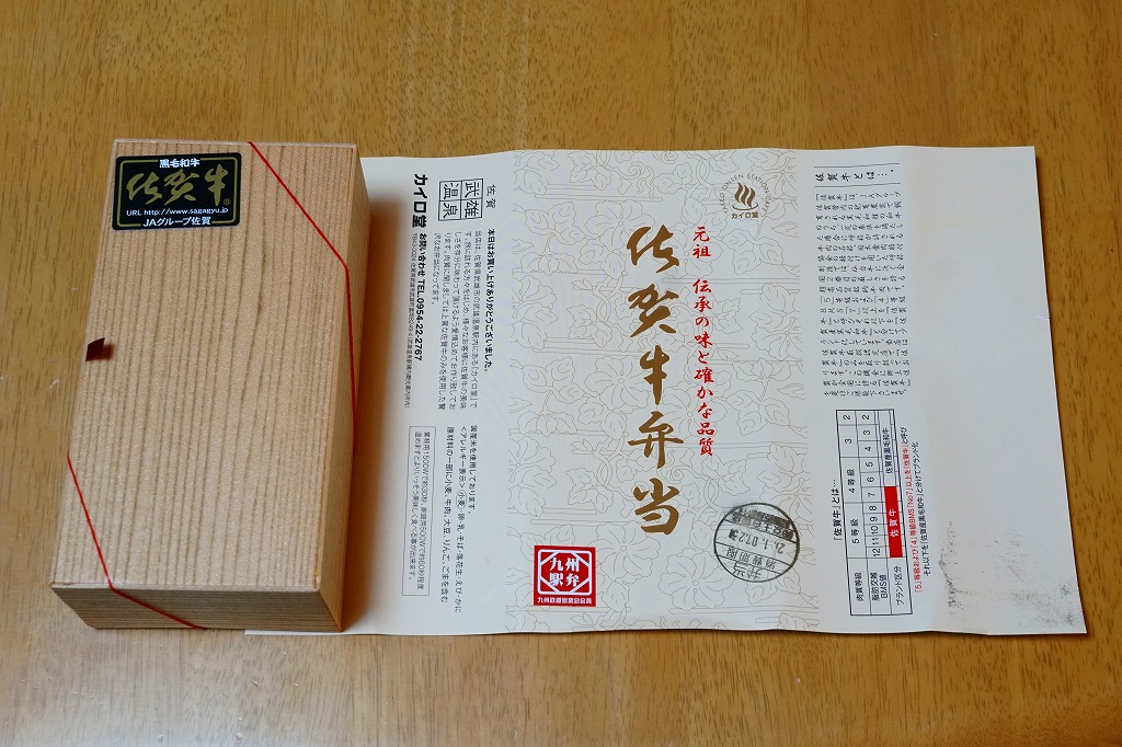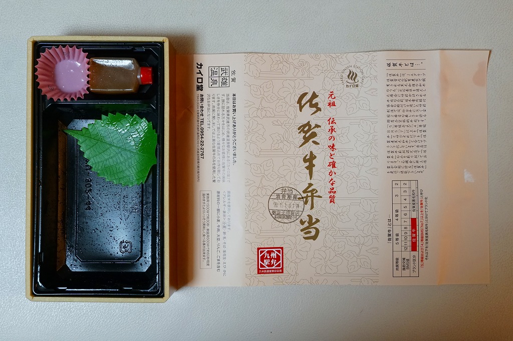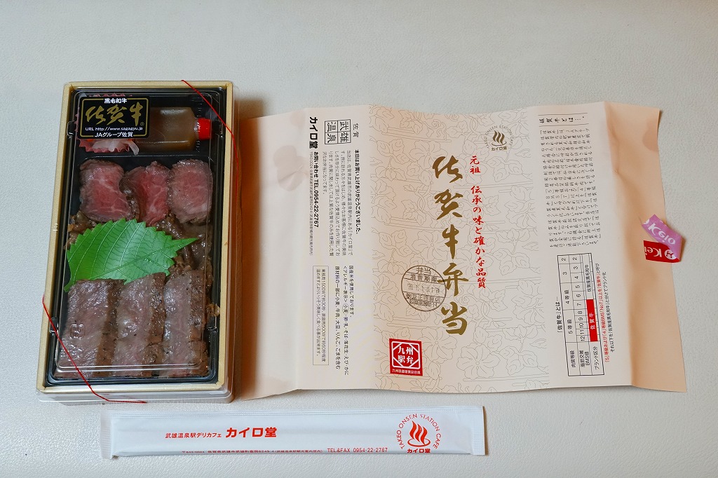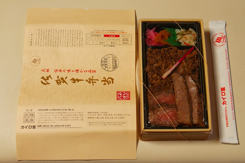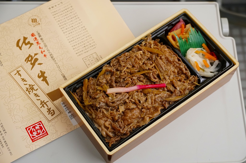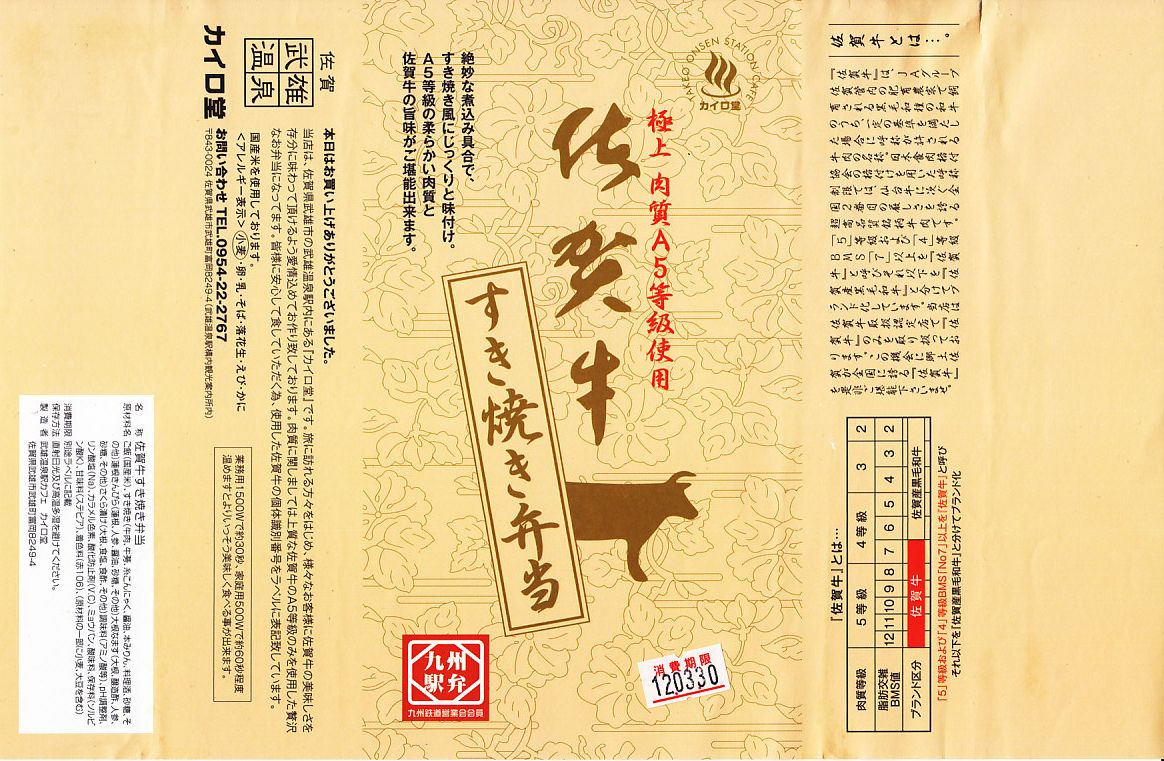2011(平成23)年4月に武雄温泉駅の駅弁として発売。この年のJR九州の駅弁キャンペーン「第8回九州駅弁グランプリ」にエントリー。長方形のプラ容器を、商品名や宣伝文を細かく描いた、クリーム色で厚めの掛紙で包む。中身は白御飯を佐賀牛のすき焼きで覆い、蓮根きんぴら、大根なます、さくら漬けを添えるもの。牛肉の駅弁としてありふれた内容であり、佐賀牛が他のブランド牛より特に優れることもないだろうが、そこそこ厚くてにゅるにゅるとした牛肉の赤身と脂身の香りと柔らかさに、他の駅弁で思い当たらない美味さと品質の良さが感じられる。