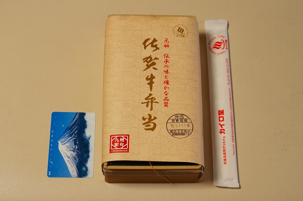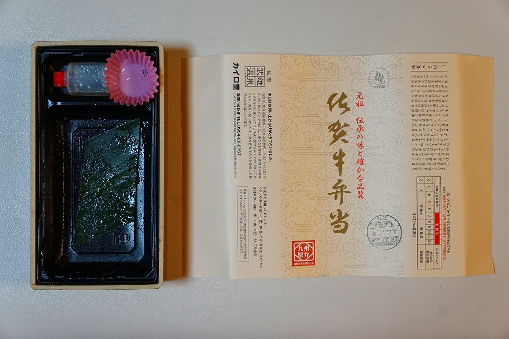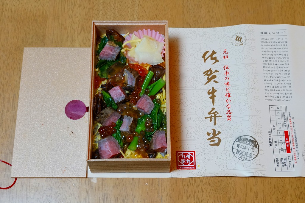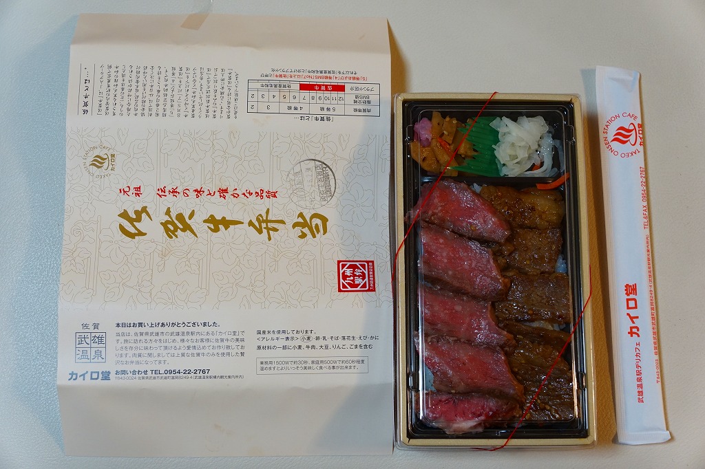 2017(平成29)年1月の京王百貨店の駅弁大会で実演販売。掛紙には「佐賀牛弁当」とあるが、百貨店での商品名は「佐賀牛ロースステーキ&カルビ弁当」であった。武雄温泉駅弁躍進の立役者である「佐賀牛すき焼き弁当」と、同じようなパッケージ。中身は百貨店での商品名のとおり、佐賀牛のロースステーキとカルビで御飯を覆うもの。東京のデパートの催事場で、行列が絶えない人気。ただ今回は、あるいはこの日は、かどうか、ロースステーキもカルビも固めで、今までのうまさがなかった感じ。半年間ほどは他の催事で売られた模様。
