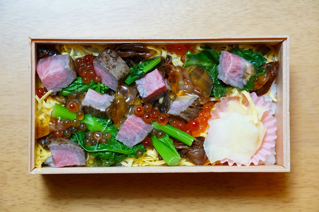 2021(令和3)年1月の京王百貨店の駅弁大会で実演販売。掛紙には「佐賀牛弁当」とあるが、百貨店での商品名は「佐賀牛肉ちらし」または「佐賀牛肉ちらし弁当」であった。仕切りのない容器に、酢飯を詰めて錦糸卵で覆い、サイコロ状の牛肉、タレのジェル、イクラ、青菜などを散らし、ガリを添える。この佐賀牛の上質な肉質による香りが、酢飯とガリの酸っぱい臭いで打ち消されてしまった感じ。内容は興味深いので、他の駅で千円程度で模倣されれば面白そう。この年の阪神百貨店の駅弁大会でも実演販売された。それ以外の場所で売られたかどうかは分からない。