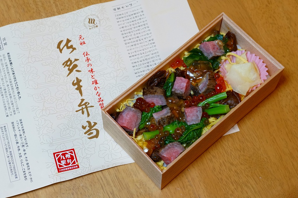 2020(令和2)年1月の京王百貨店の駅弁大会で実演販売。掛紙には「佐賀牛弁当」とあるが、百貨店での商品名は「佐賀牛ザブトンステーキ・ローストビーフ・ロースすき焼き弁当」であった。武雄温泉駅弁躍進の立役者である「佐賀牛すき焼き弁当」と、同じようなパッケージ。中身は百貨店での商品名のとおり、佐賀牛をザブトンステーキ、ローストビーフ、ロースすき焼きの3種類で分担し御飯を覆うもの。