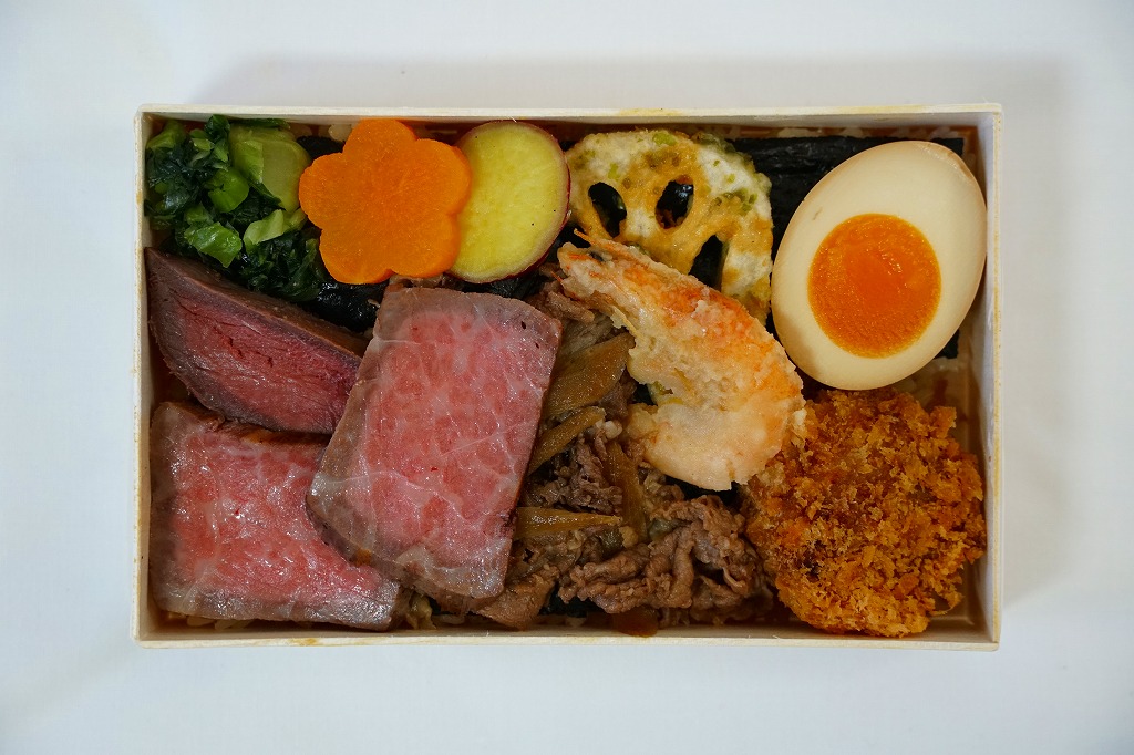 おかずの種類と盛り付けで、肉も肉以外もうまみが凝縮されたような、絶品で高級な海苔弁当。引き続き、百貨店の駅弁催事でお肉がうまい。2023年1月の京王百貨店と阪神百貨店と鶴屋百貨店の駅弁大会で実演販売された催事弁当「ふたつ星一段重弁当」のリニューアルにもみえる。