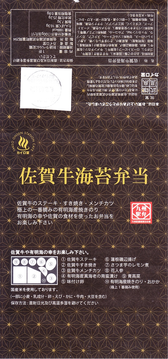 味付飯の上を有明海産の焼きのりとおかかで覆い、佐賀牛出汁漬けローストビーフ、おろしポン酢、佐賀牛ステーキ、佐賀牛メンチカツ、蓮根磯辺揚げ、人参、味付け卵、有明海産真海老の南蛮漬け、青高菜で覆う。小柄で具だくさんの牛ステーキ弁当であり、牛肉が前面で全面で強い武雄温泉駅弁に対して、牛肉が控えめで味わい深い小箱になっていたと思う。