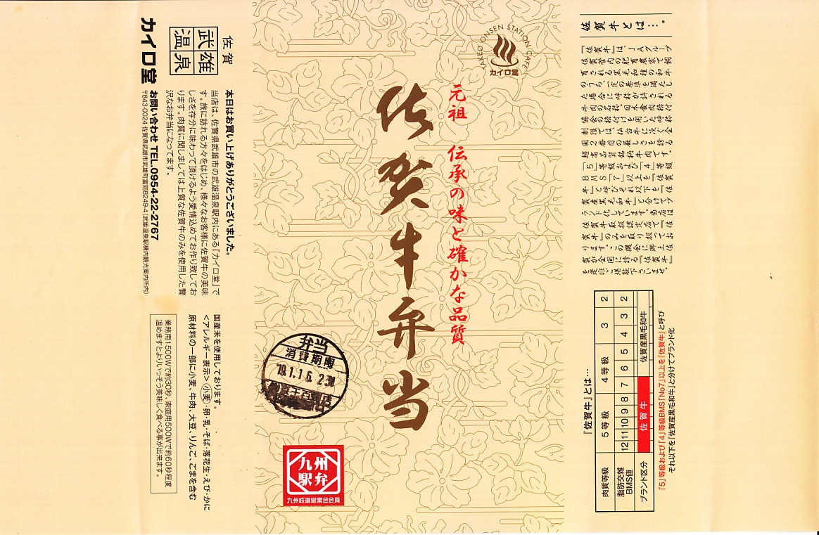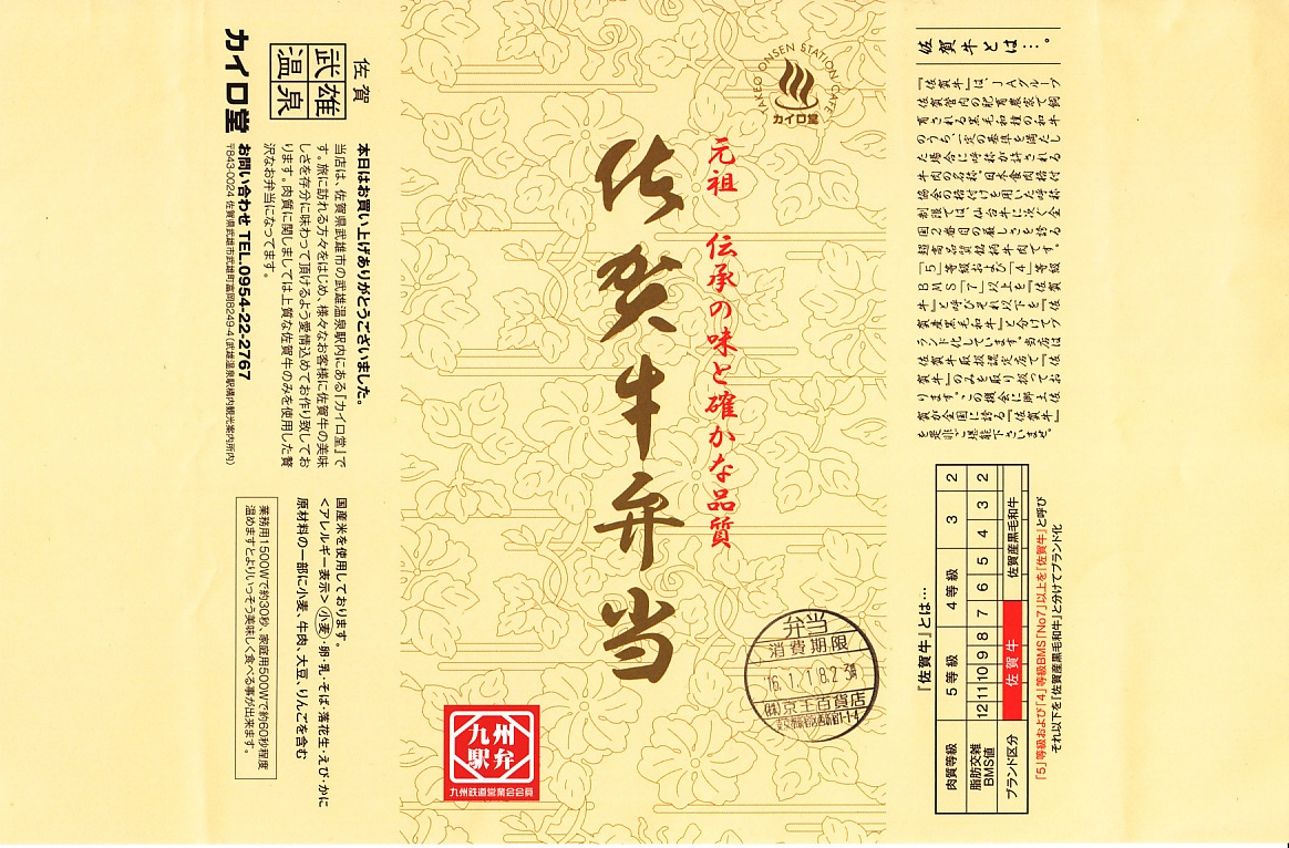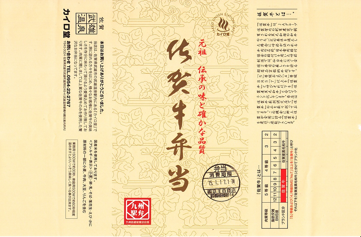 2014(平成26)年1月17日に購入した、武雄温泉駅弁の掛紙。京王百貨店の駅弁大会で購入。この時は掛紙も容器も中身も価格も風味も、現地と同じであった。後の実演販売では「佐賀牛弁当」の掛紙を使い、肉の内容をアレンジしてくる。