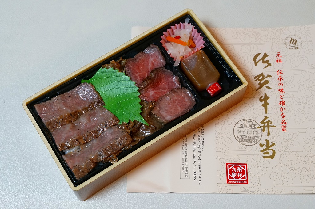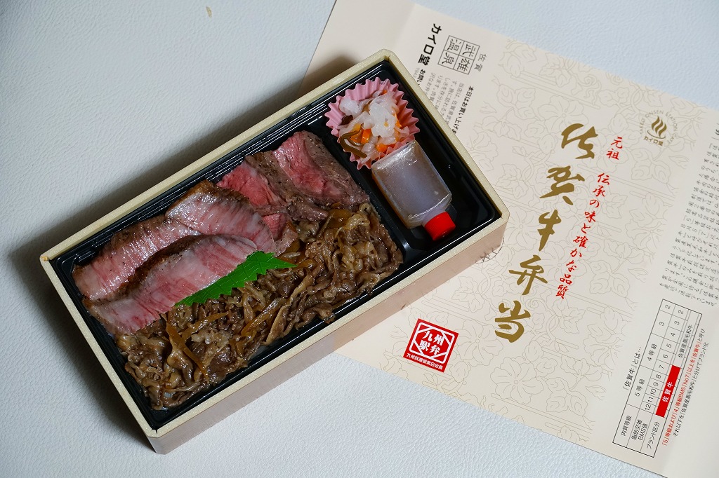 2021(令和3)年1月の京王百貨店の駅弁大会で実演販売。掛紙には「佐賀牛弁当」とあるが、百貨店での商品名は「佐賀牛サーロインとランプステーキ&すき焼き弁当」であった。佐賀牛すき焼き弁当と同じ容器と、この実演販売で共通の掛紙を使う。中身は白飯を牛ステーキと牛すき焼きで覆い、酢の物とタレを添えるもの。ステーキはさすがの常温でとろける霜降り牛。一方で牛すき焼き肉の味が平凡だったのは意外。この年の阪神百貨店や鶴屋百貨店の駅弁大会でも実演販売された。それ以外の場所で売られたかどうかは分からない。