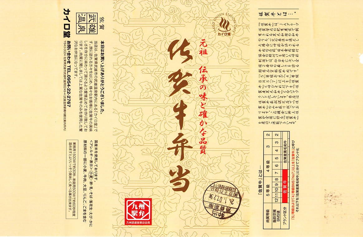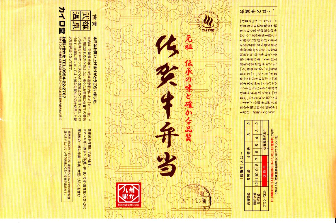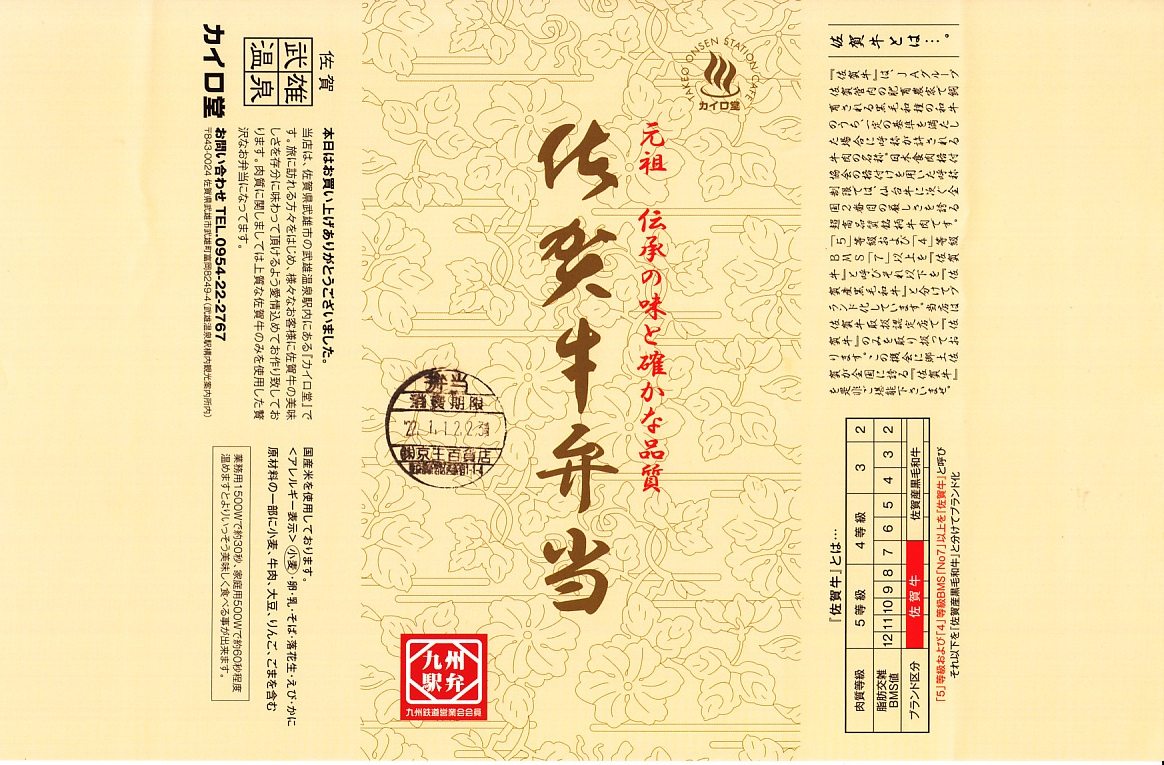 2012(平成24)年3月30日に購入した、武雄温泉駅弁の掛紙。上記の2022年のものと、書いてあることはおおむね変わらない。容器と中身は同じ。百貨店の催事場での実演販売では、この掛紙を使わず、「佐賀牛弁当」と書いた掛紙を使う。