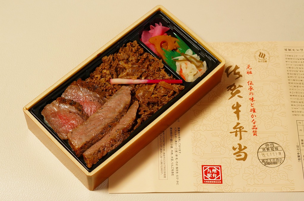 2019(平成31)年1月の京王百貨店の駅弁大会で実演販売。掛紙には「佐賀牛弁当」とあるが、百貨店での商品名は「佐賀牛ロースステーキ三昧弁当」であった。武雄温泉駅弁躍進の立役者である「佐賀牛すき焼き弁当」と、同じようなパッケージ。中身は百貨店での商品名のとおり、佐賀牛をロースステーキ、ローストビーフ、バラ肉の煮込みの3種類で分担し御飯を覆うもの。