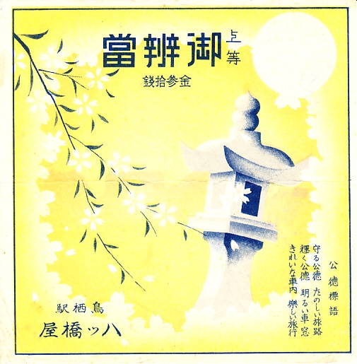 おそらく1930年代のものと思われる、昔の鳥栖駅弁の掛紙。鳥栖とは思えない山河の風景に、門司鉄道局が1926(大正15)年に募集したという送迎遠慮標語(または送迎廃止標語)の当選作を列記した。上等弁当で価格が30銭なので、1926年の掛紙ではないと推定した。