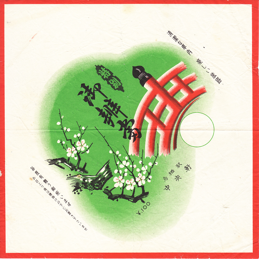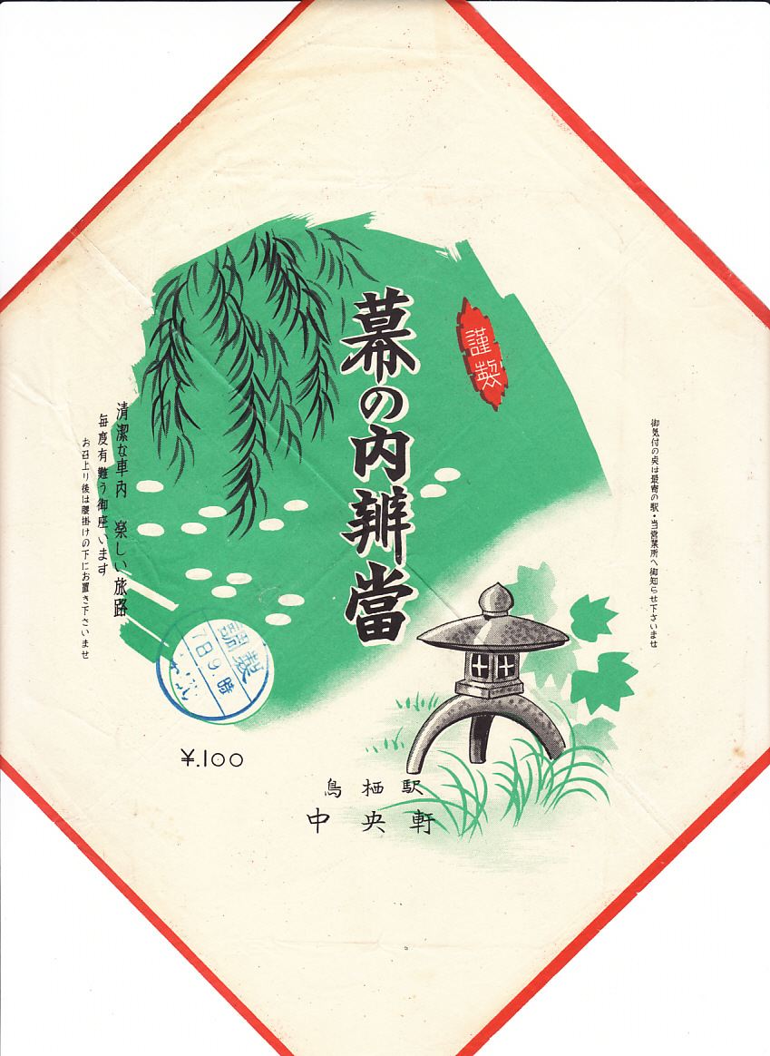 1950年代のものと思われる、昔の鳥栖駅弁の掛紙。「鳥栖駅 中央軒」の文字がないと、どこの駅弁なのか分からないくらい、特段の個性がない絵柄である。