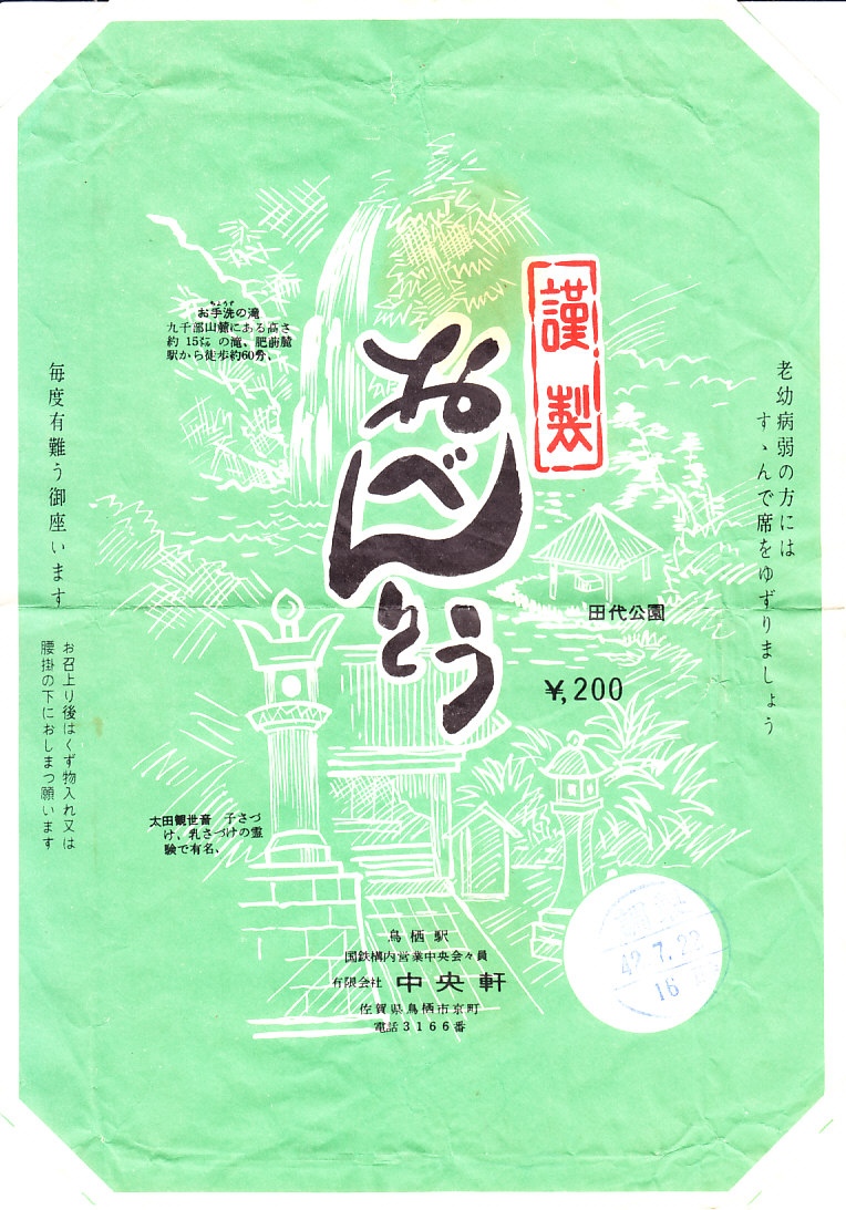 1967(昭和42)年7月22日16時の調製と思われる、昔の鳥栖駅弁の掛紙。お手洗の滝(おちょうずのたき)、田代公園、太田観世音という、市販の観光案内には載りそうにないような名所が描かれた。