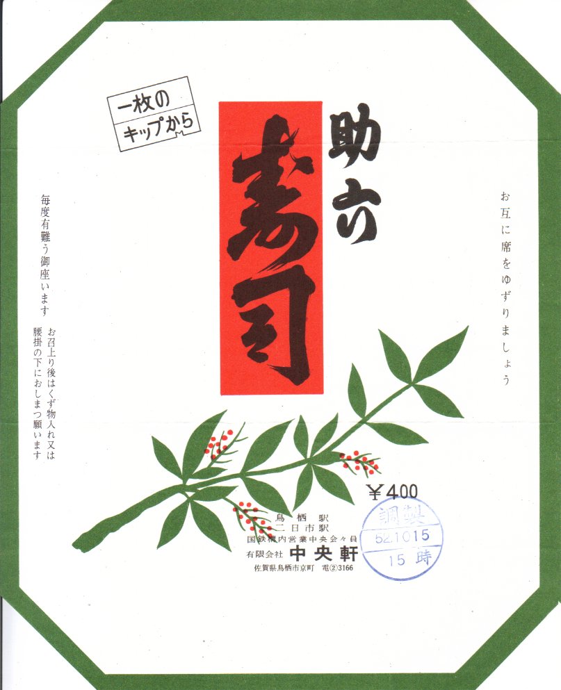 1977(昭和52)年10月15日の調製と思われる、昔の鳥栖駅弁の掛紙。当時はすでに新幹線が博多に乗り入れて九州内を電車特急が駆けめぐっていた頃であるが、この掛紙には「お召上り後は…腰掛けの下におしまつ願います」と、まだ汽車の時代のような昔ながらの注意喚起が残る。鳥栖駅に加えて二日市駅でも売られたことがわかる。
