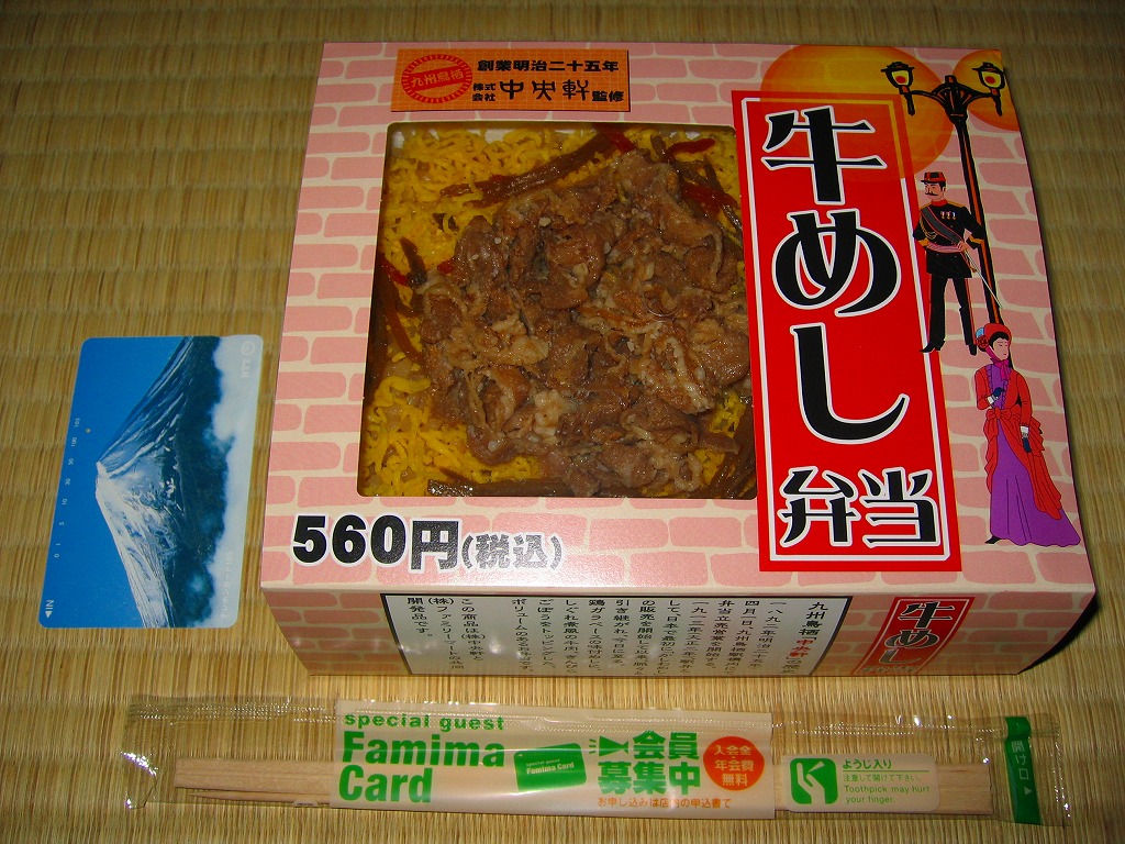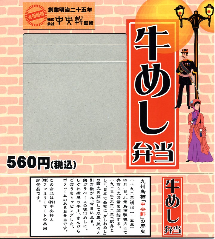 鳥栖駅の駅弁屋である中央軒の監修により、2006(平成18)年3月7日から20日まで、コンビニエンスストア大手のファミリーマートの全国各地の店舗で販売された商品。中が白く外が黒いプラ容器に、味付飯を詰めて錦糸卵としぐれ煮風牛肉などを載せて、鶏肉と高菜などを添える。