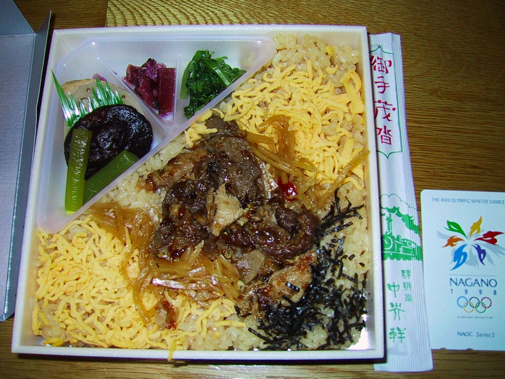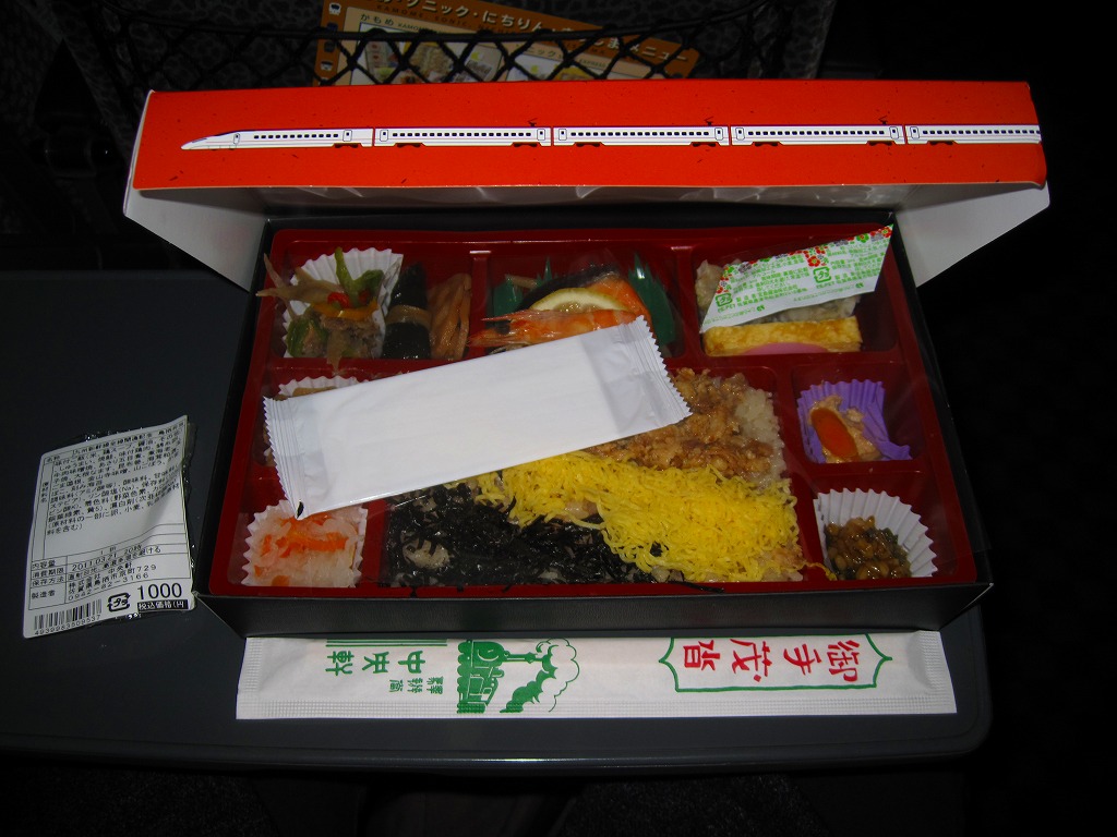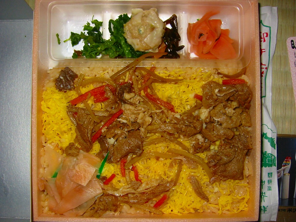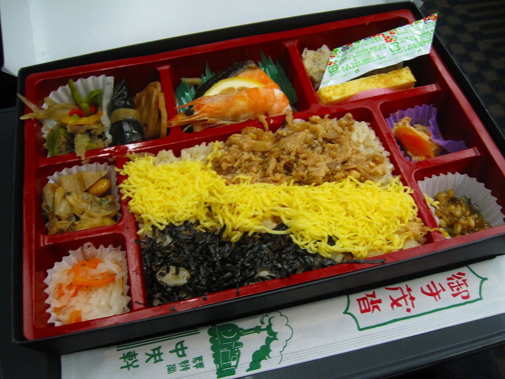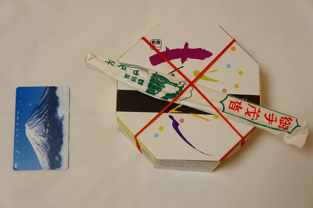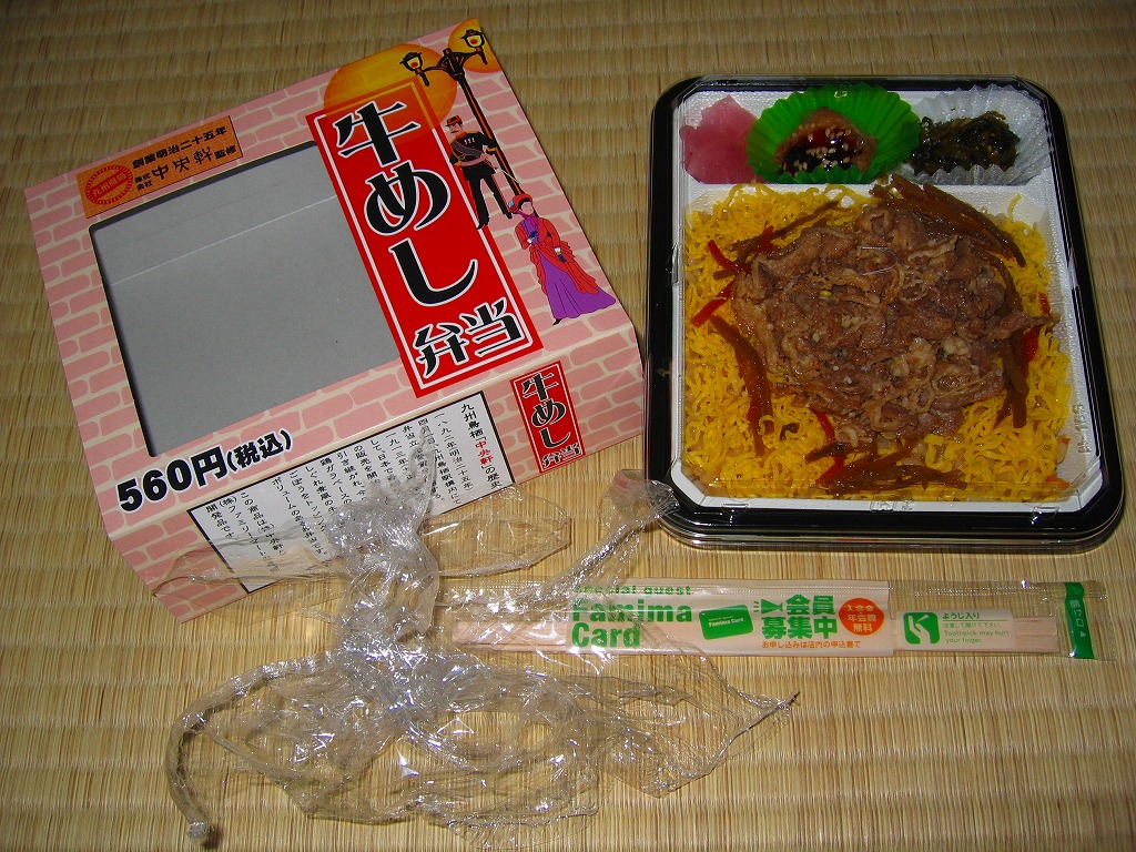 どうしてこれに購入時で1,100円もの値を付けるのか、疑問にしか思えない商品。大根漬の散乱は輸送販売では仕方がなくても、「九州の駅弁ランキング」などの見本写真では、もっと肉も高菜も入っているようなので、東京へたくさん送る際に手抜きか間違いでもあったのか。牛肉と高菜の九州風な甘い味付けも、首都圏での販売では厳しかった。2014年4月の消費税率改定で1,140円。2018年までの販売か。